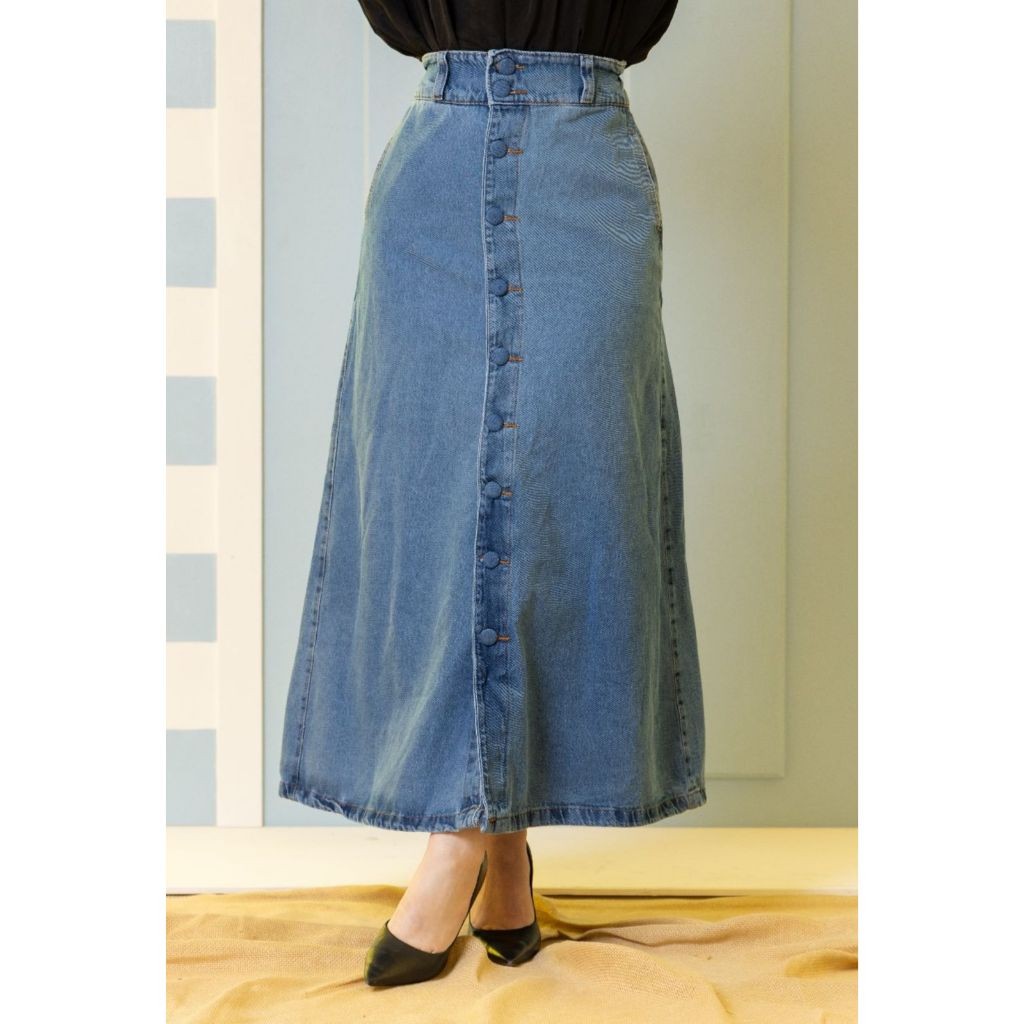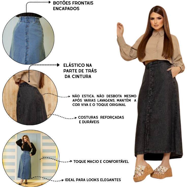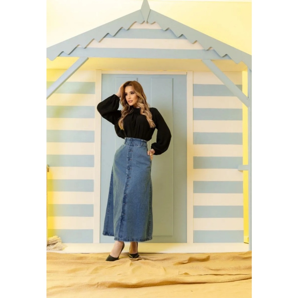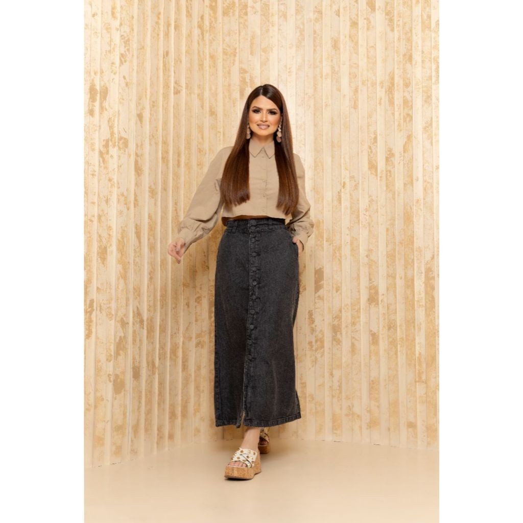 Saia Longa Midi Vintage, Azul Claro ou Azul Escuro Jeans Feminina Cintura Alta com Botões