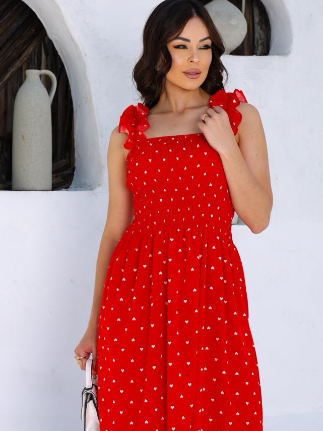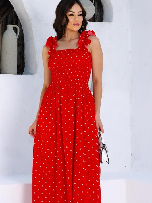 Vestido Longo Vermelho Estampado de Corações - Alças com Babado e Lastex