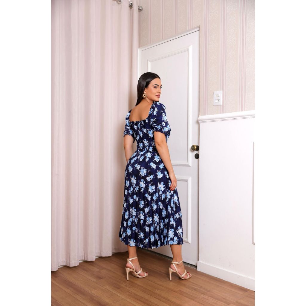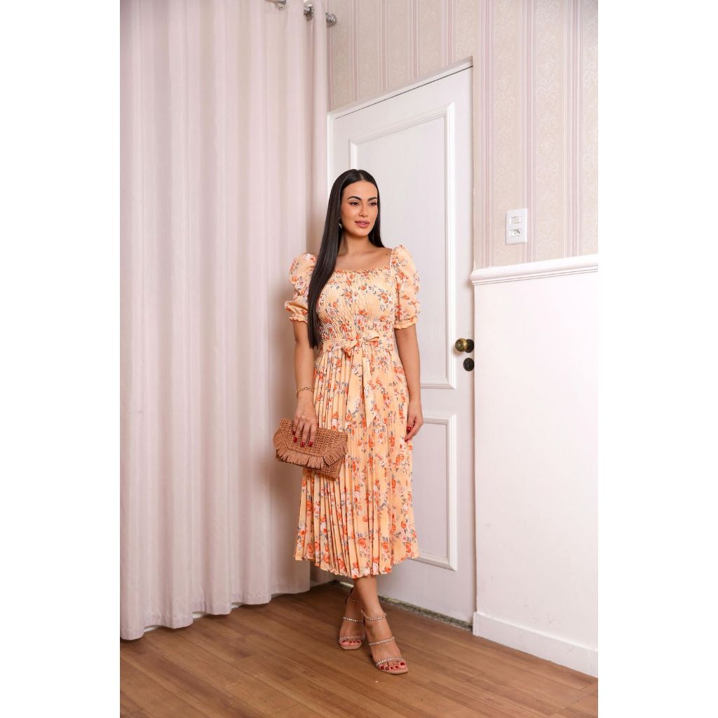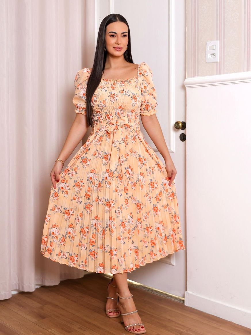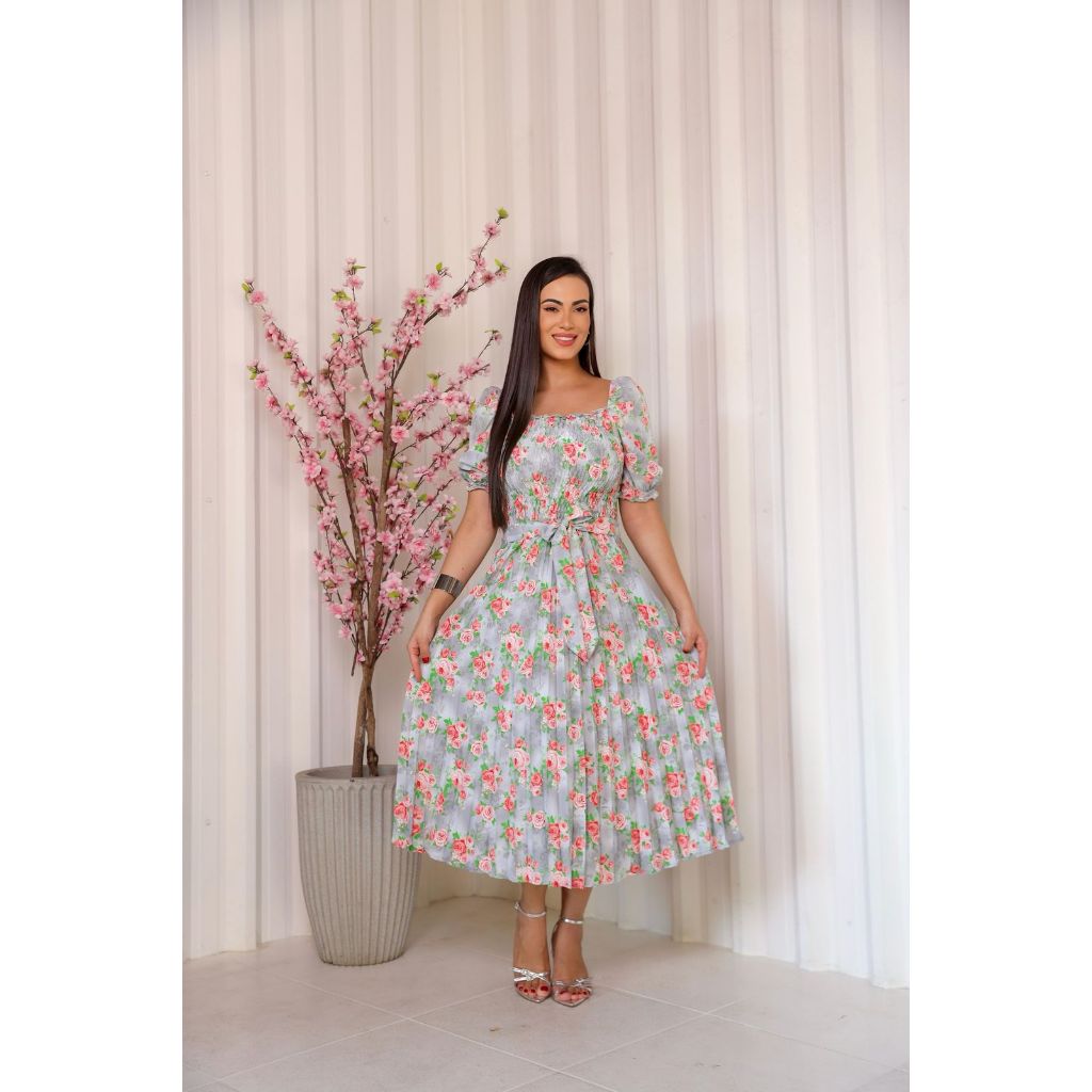 Vestido Plissado Floral Feminino Manga Bufante