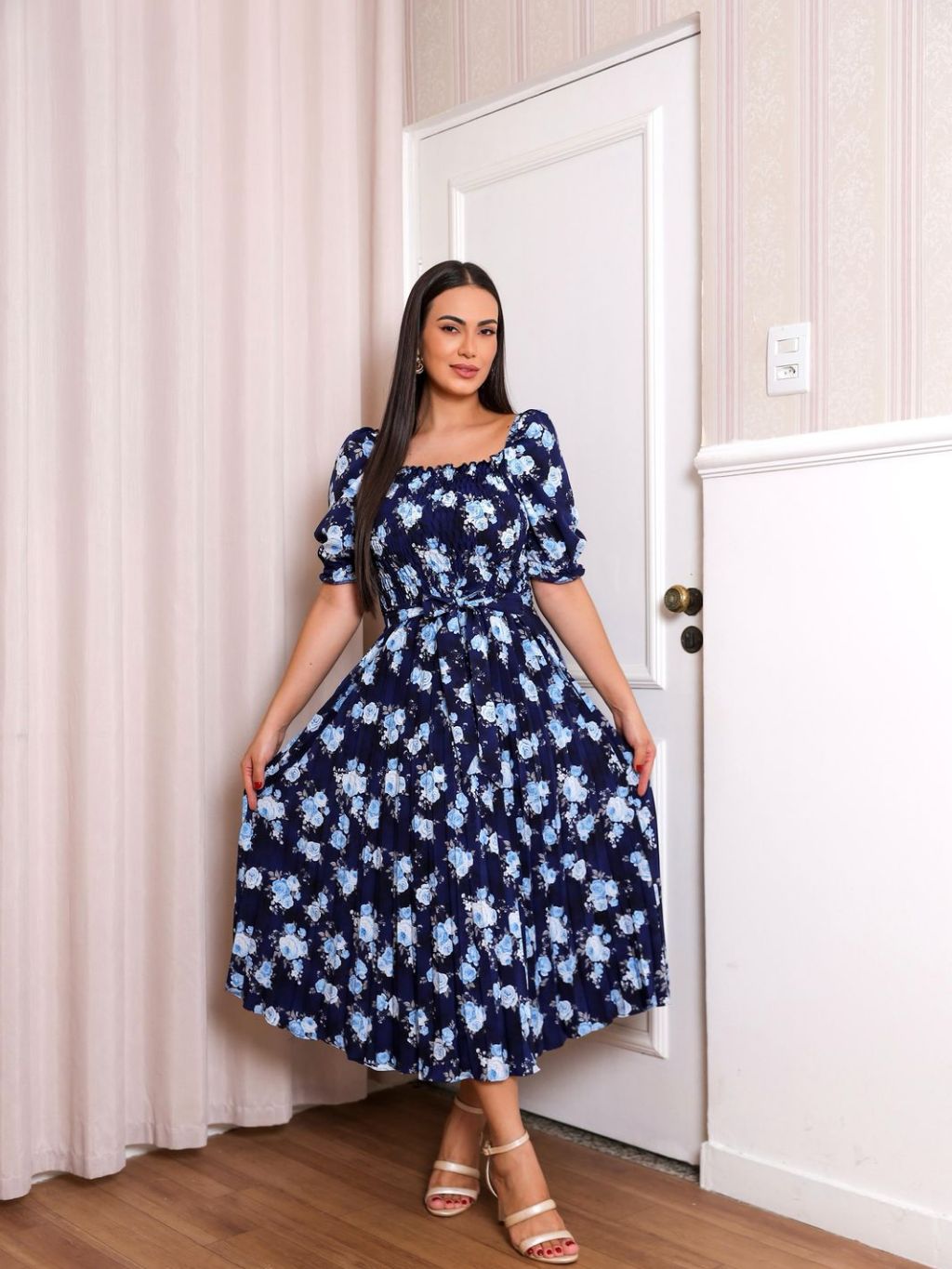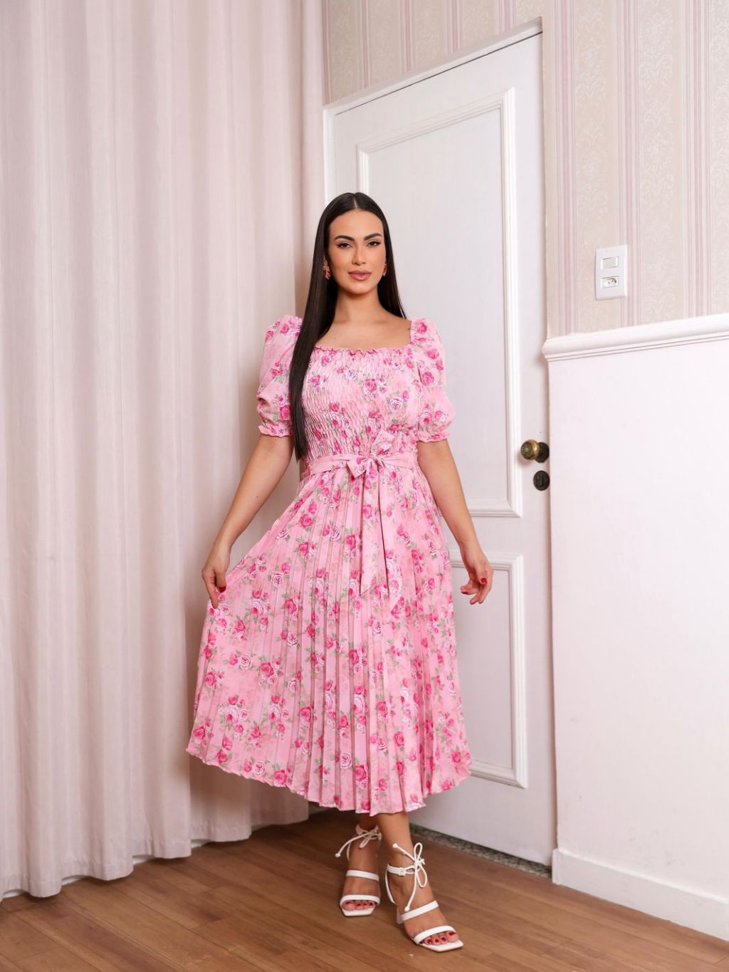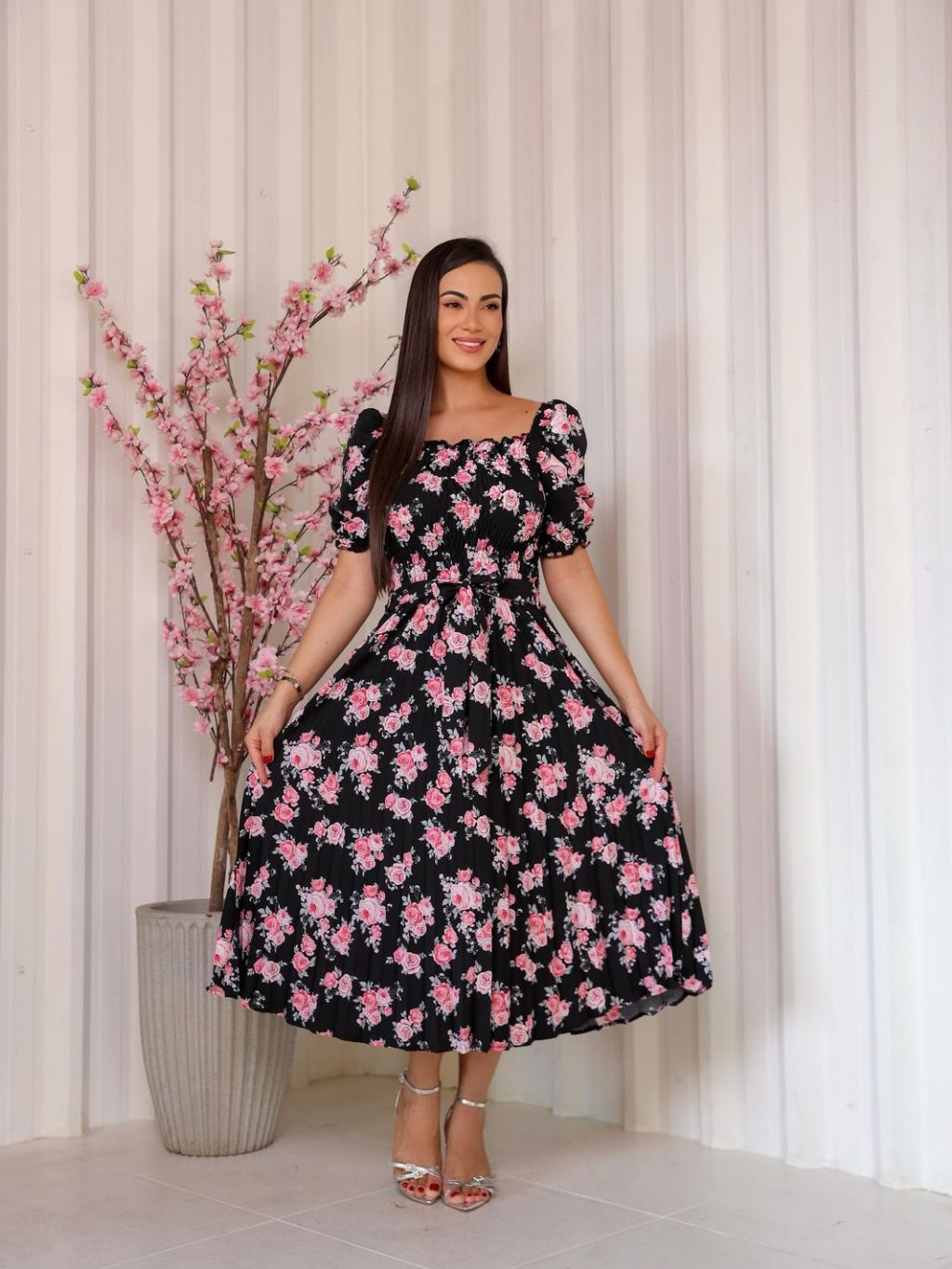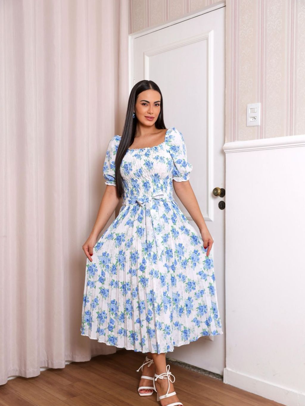 Vestido Plissado Floral Feminino Manga Bufante
