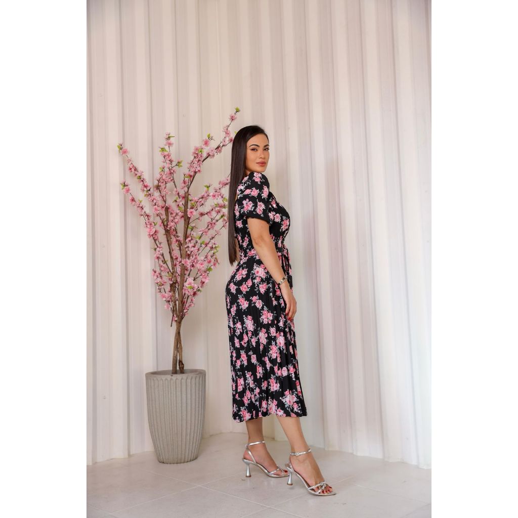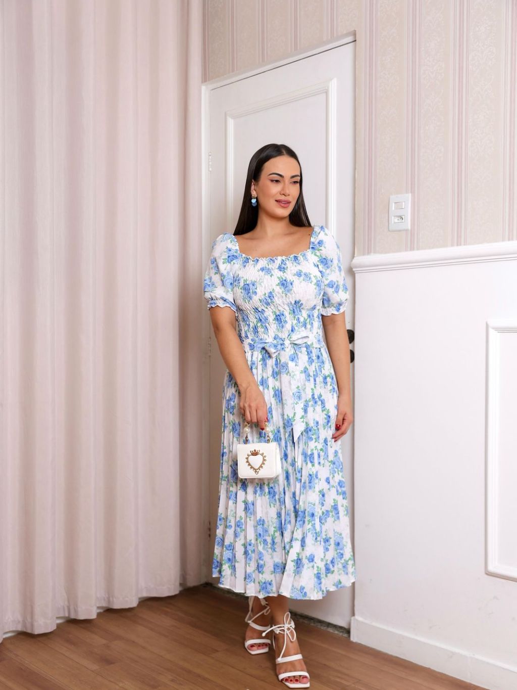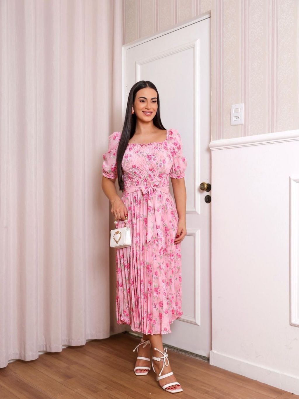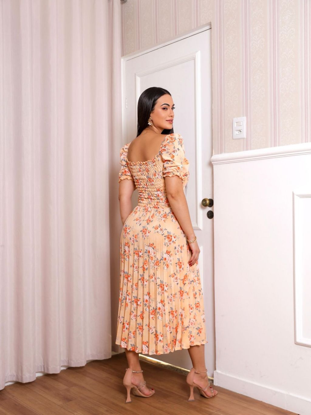 Vestido Plissado Floral Feminino Manga Bufante