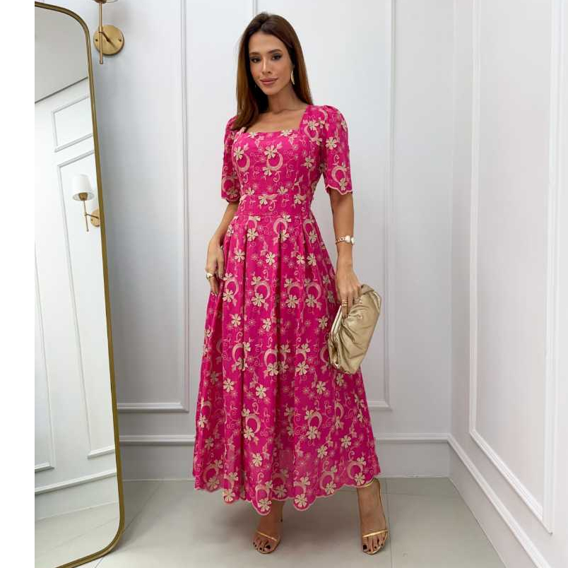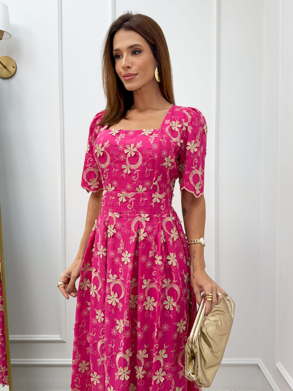 Vestido Midi Lese Bordado 3D Com Manga Princesa