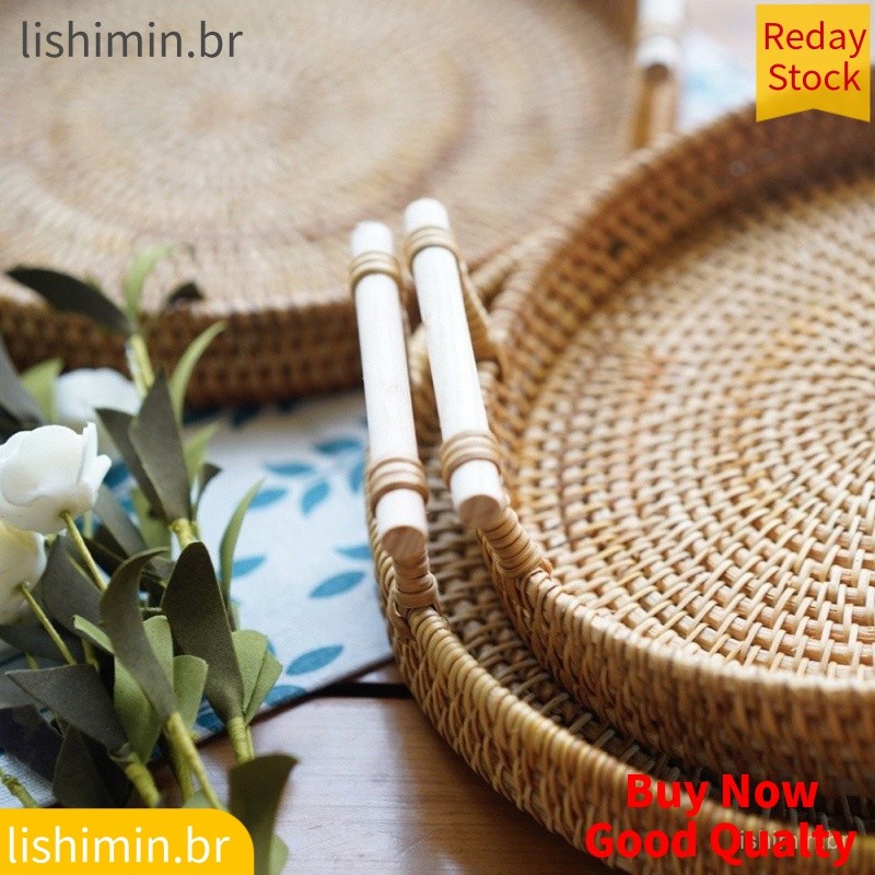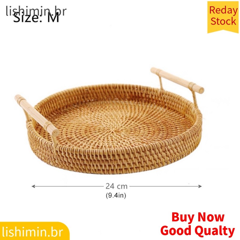 Bandeja De Rattan Armazenagem Redonda Com Cabo De Madeira Para Pão De Frutas Servir Alimentos