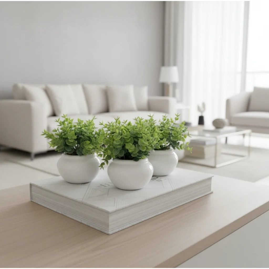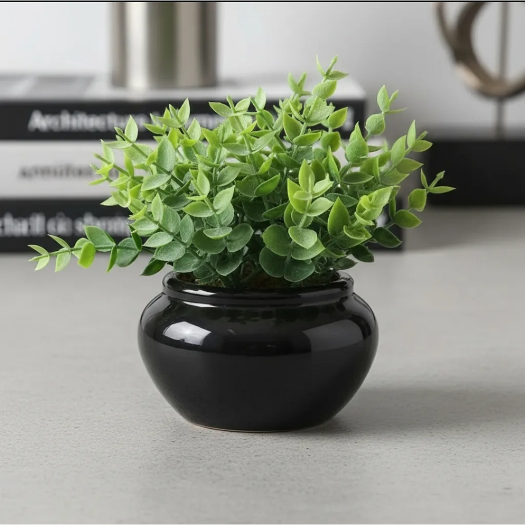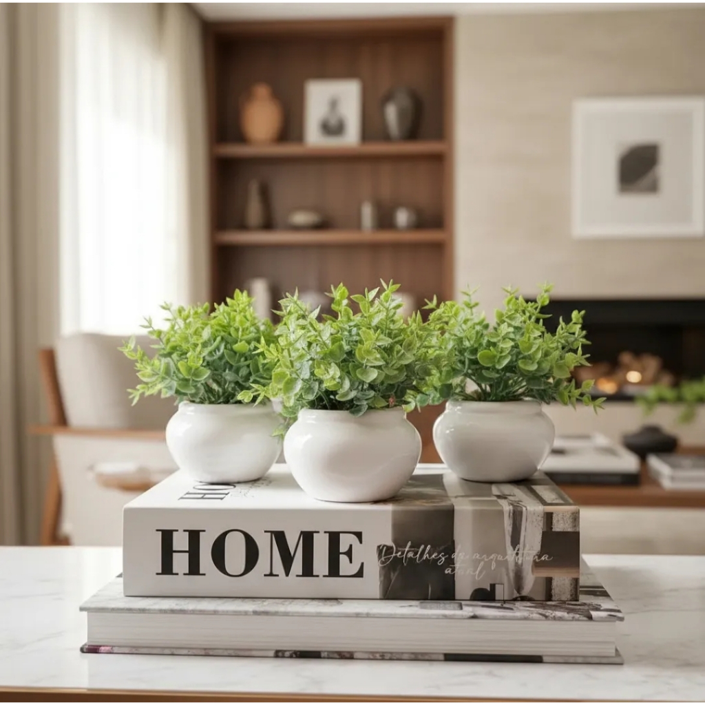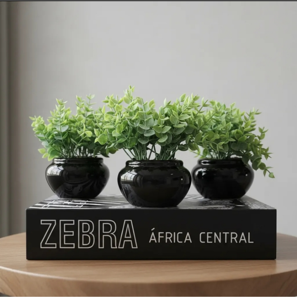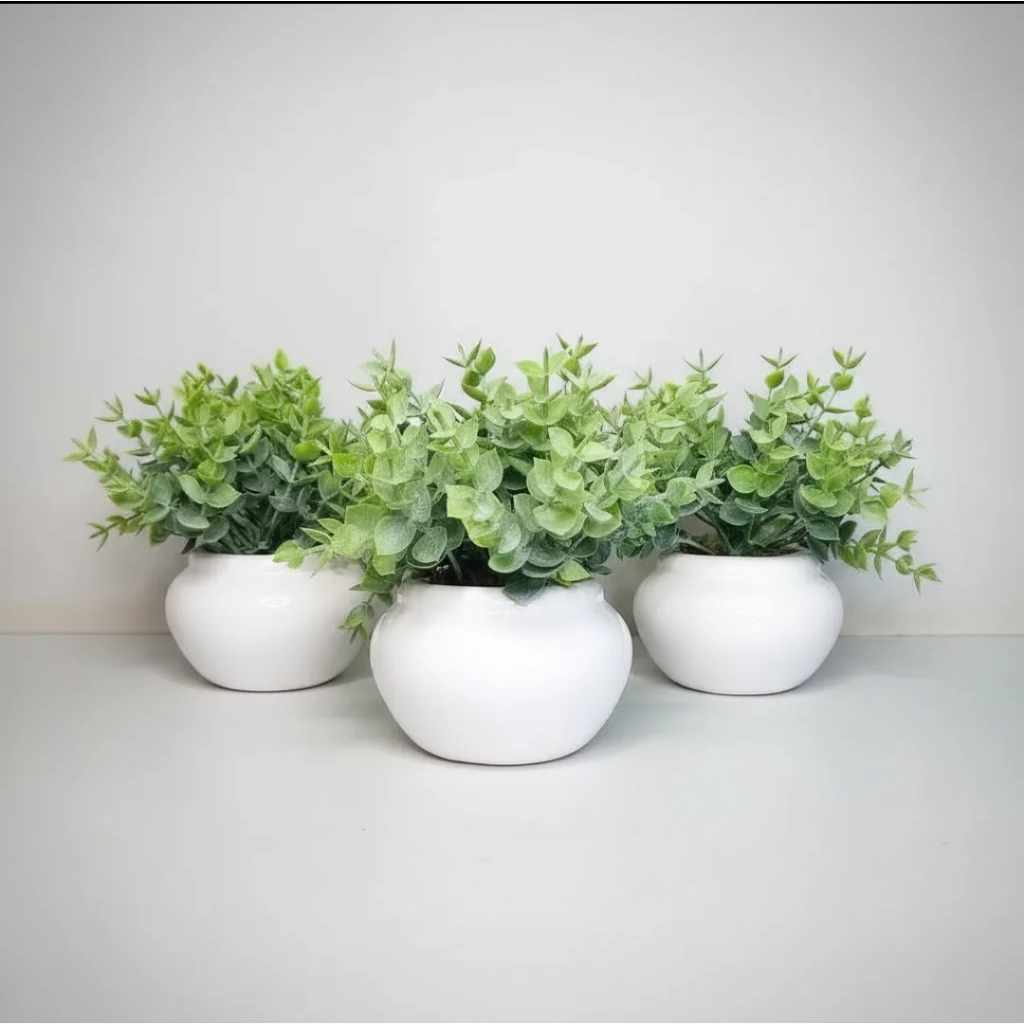 Kit 3 vasinhos de cerâmica com folhagem de eucalipto artificial branco ou preto