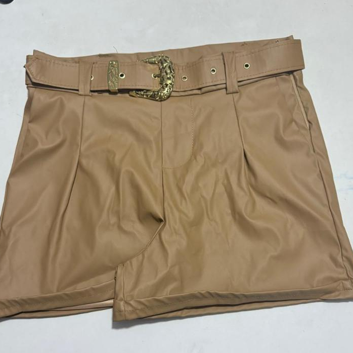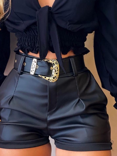 Shorts Feminino em Couro fake Cinto com Fivela Preto