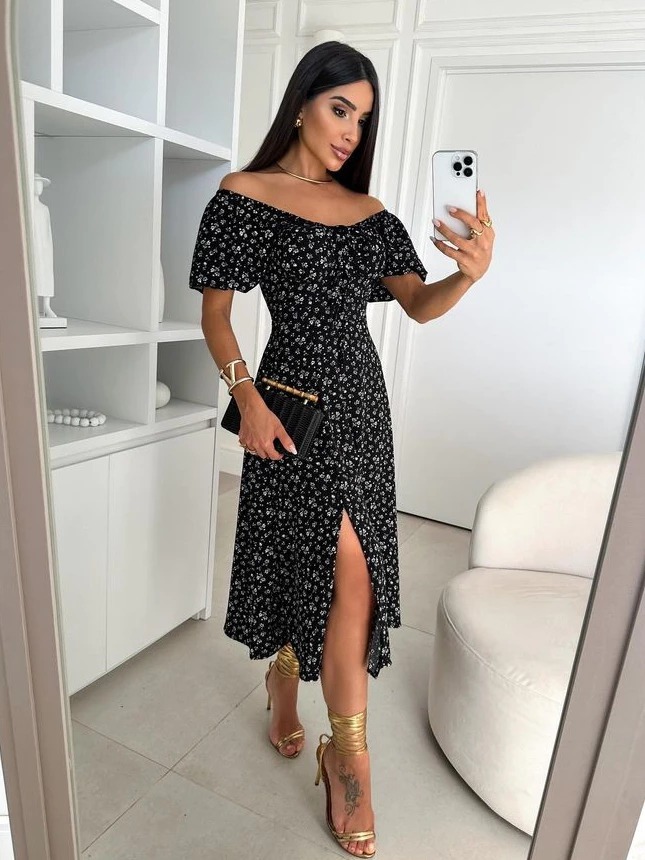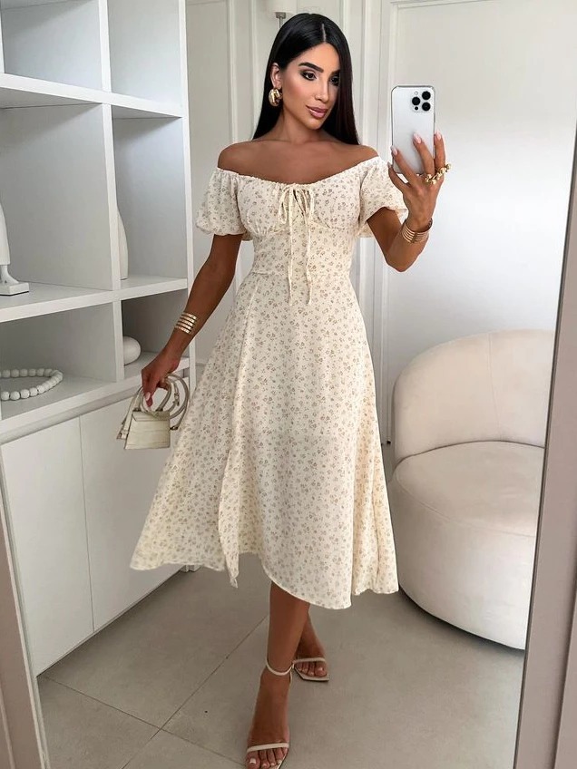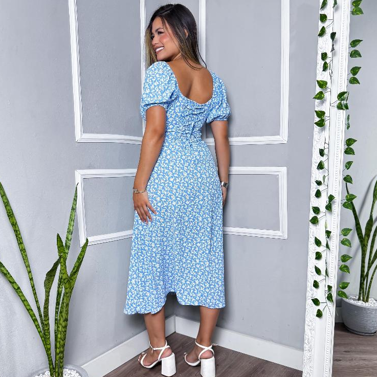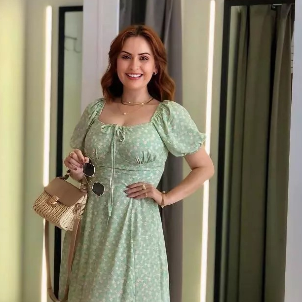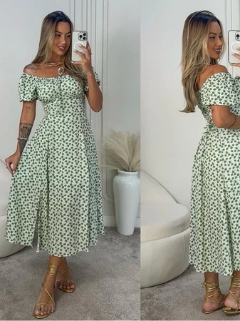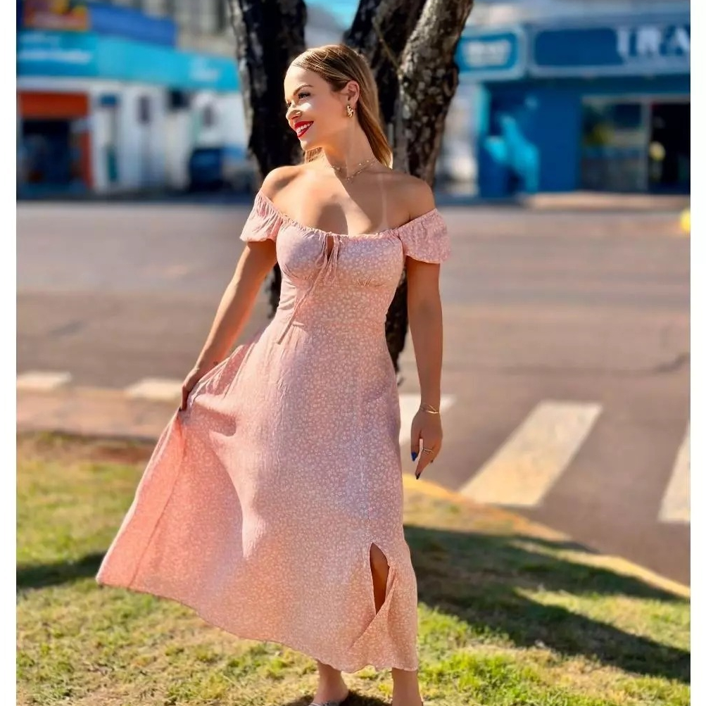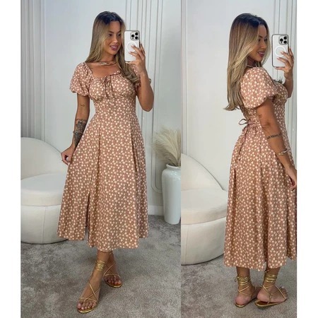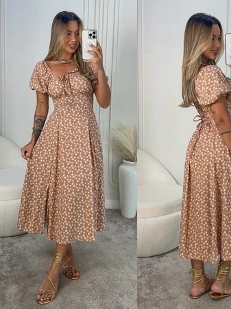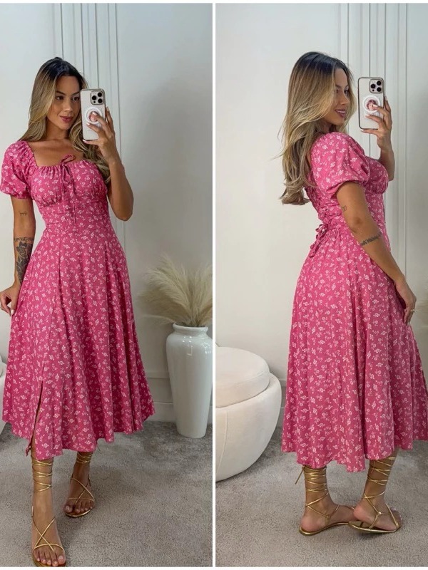 0 Vestido Mídi Romântico Estampado Floral com Manguinha e Elastex Cruzado Costa Moda 2026