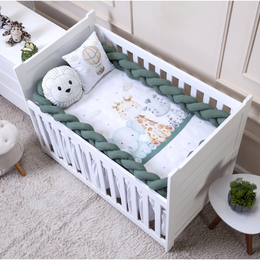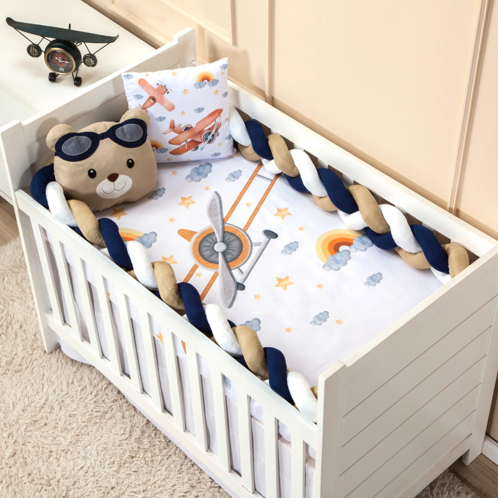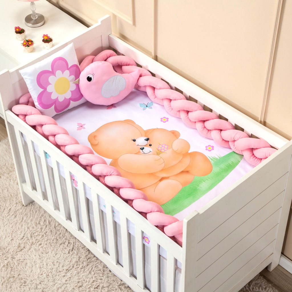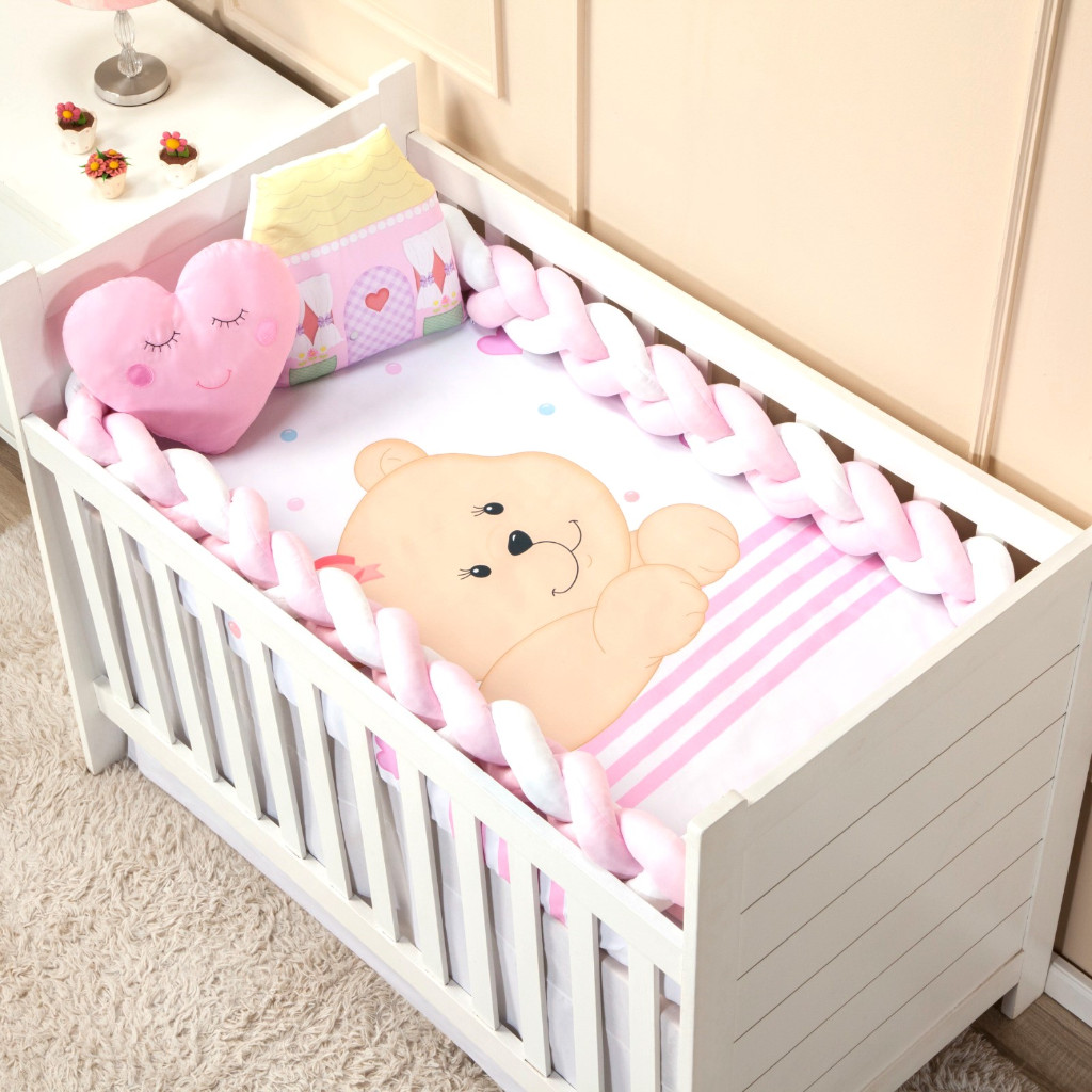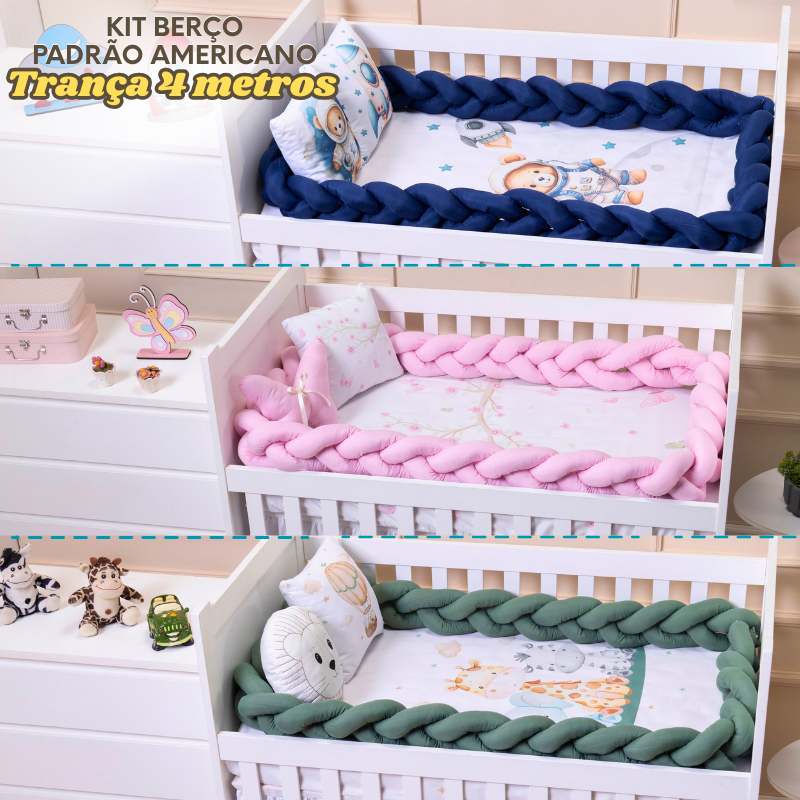 Kit berço Americano Nacional 4 peças menina menino Protetor trança 4 metros lençol almofada bordada