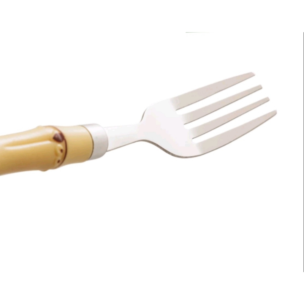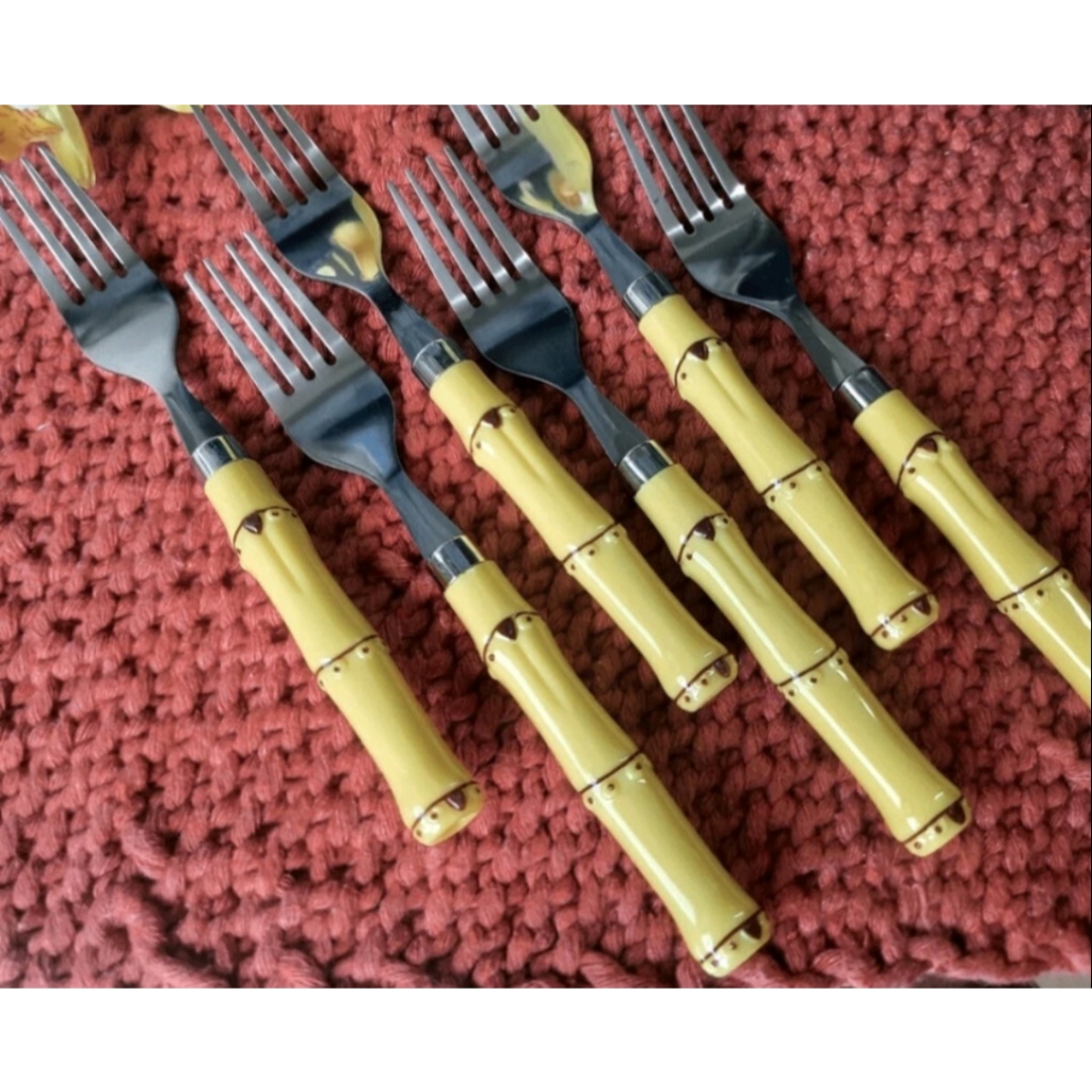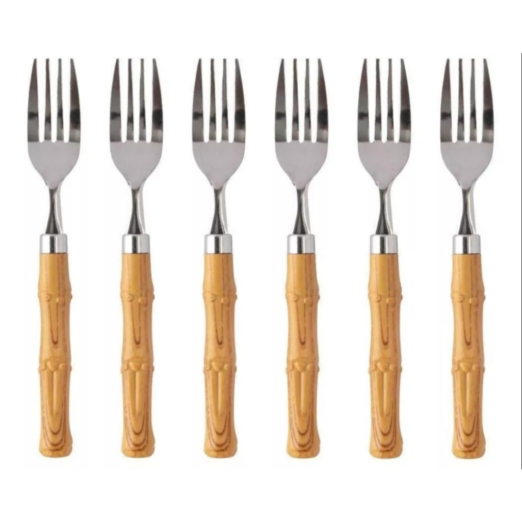 KIT COM 6 GARFOS DE MESA EM ACO INOX CABO BAMBU IMITANDO MADEIRA PLASTICO