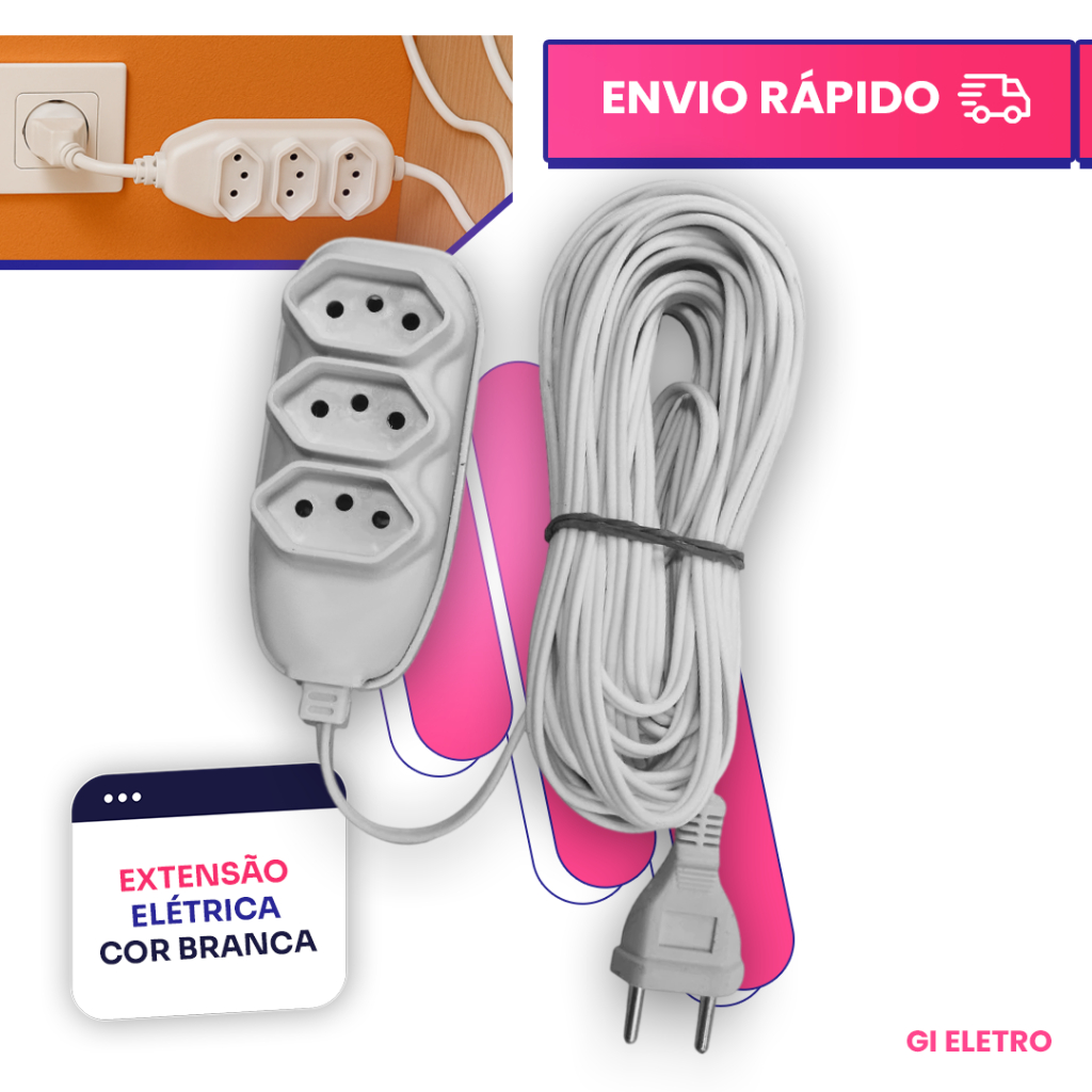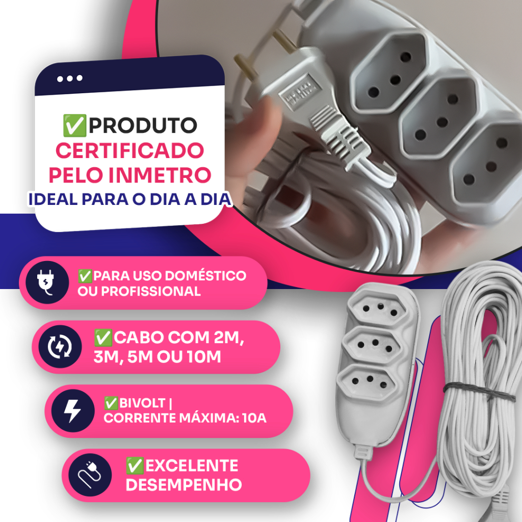 EXTENSÃO ELÉTRICA 2/3/5/10 METROS TRIPOLAR 10A BIVOLT - BRANCA OU PRETA