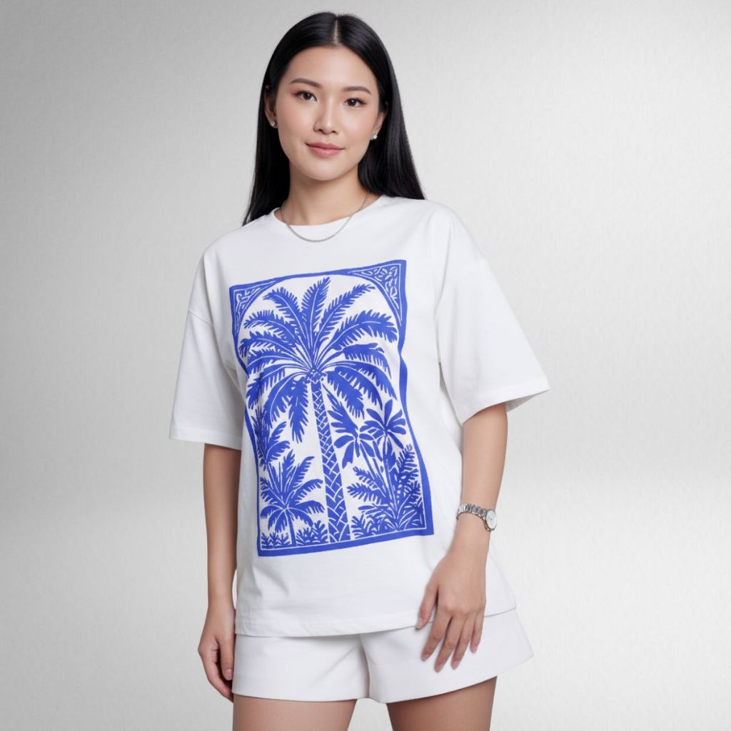 Camiseta Max Oversized Feminina Estampa Coqueiro Azul 100% Algodão
