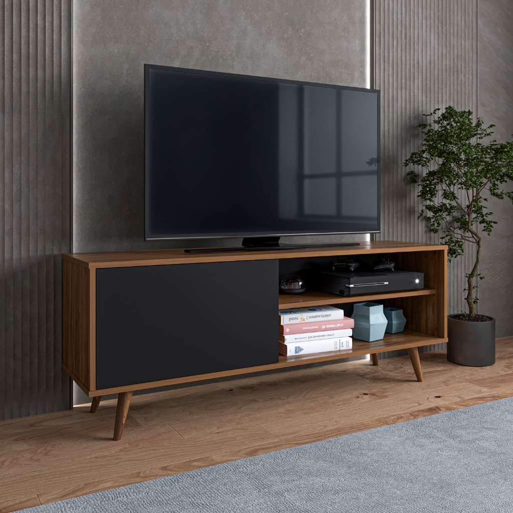 Rack home para tv até 43 polegadas sala com porta e 2 prateleiras pés de madeira varias cores