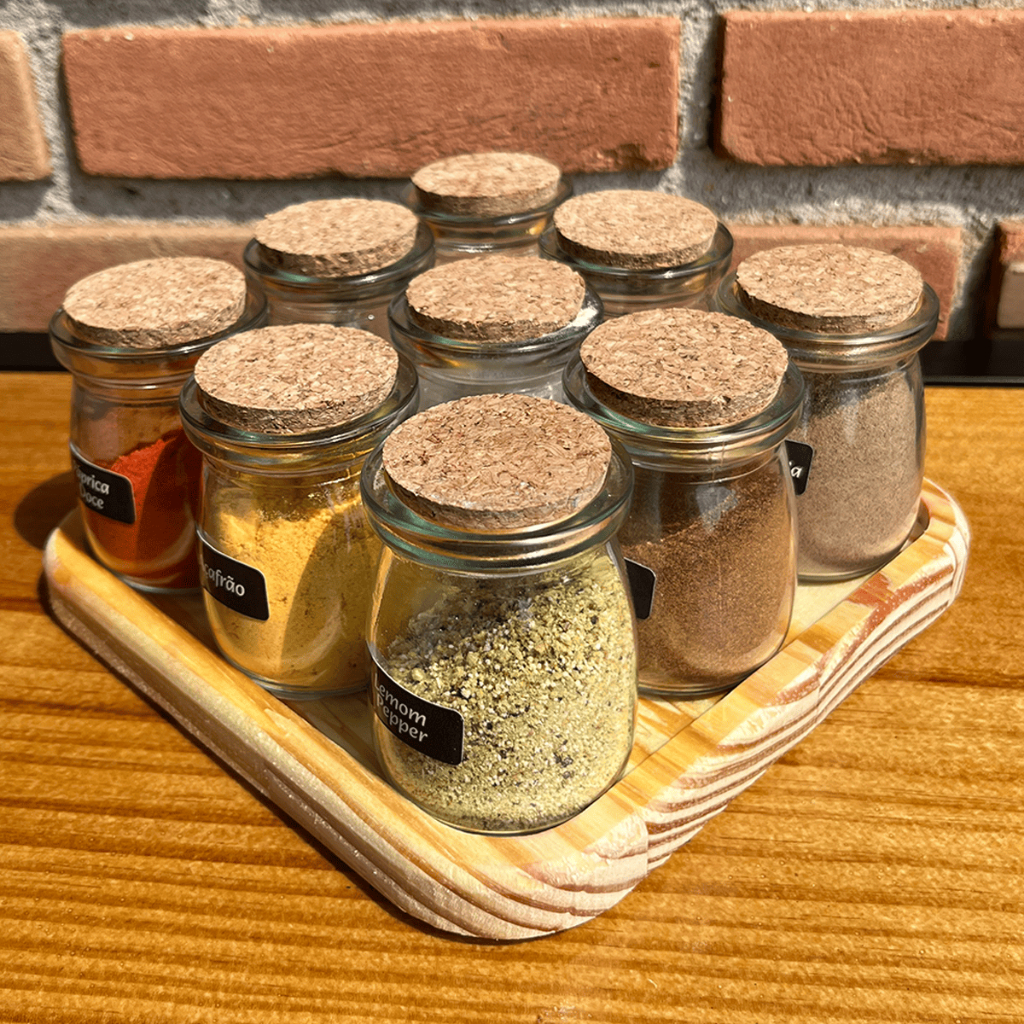 Porta Tempero Organizador de Cozinha com 9 Potes de Vidro 110ml com Adesivos Base Madeira Hermético