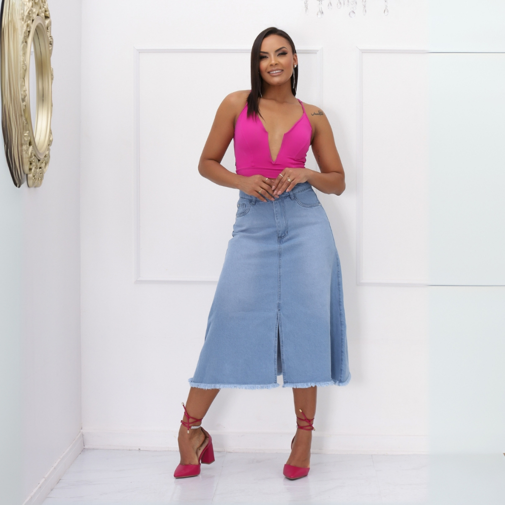 Saia Jeans Feminina Evasê Midi Barra Desfiada