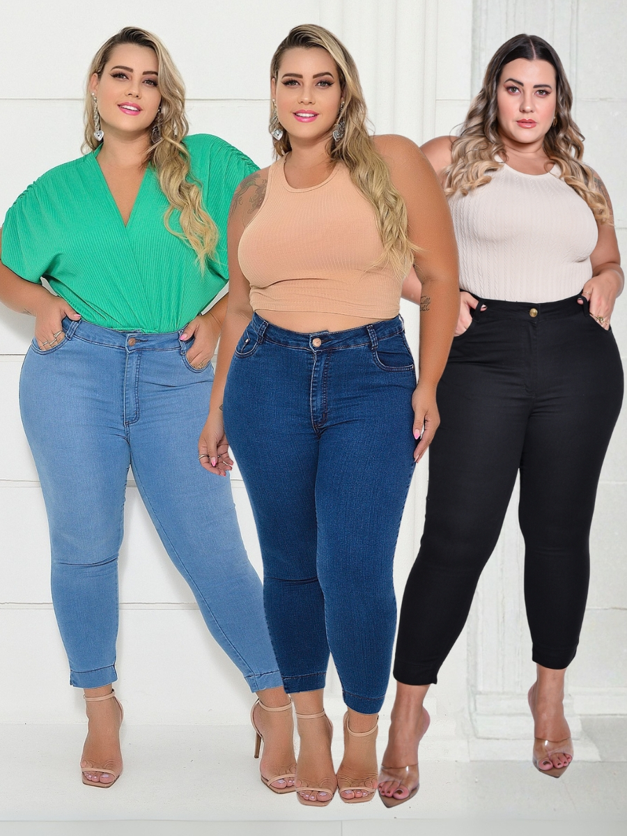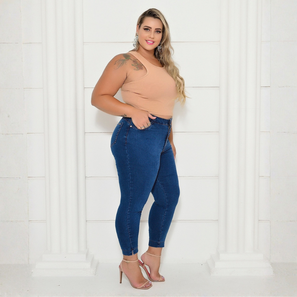 Calça Jeans Plus Size Capri Cintura Alta Pescador Curta Abertura na Barra