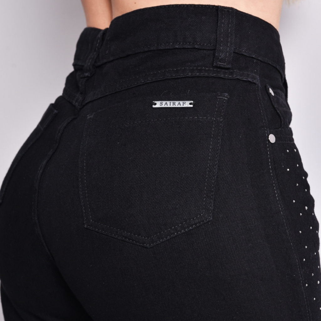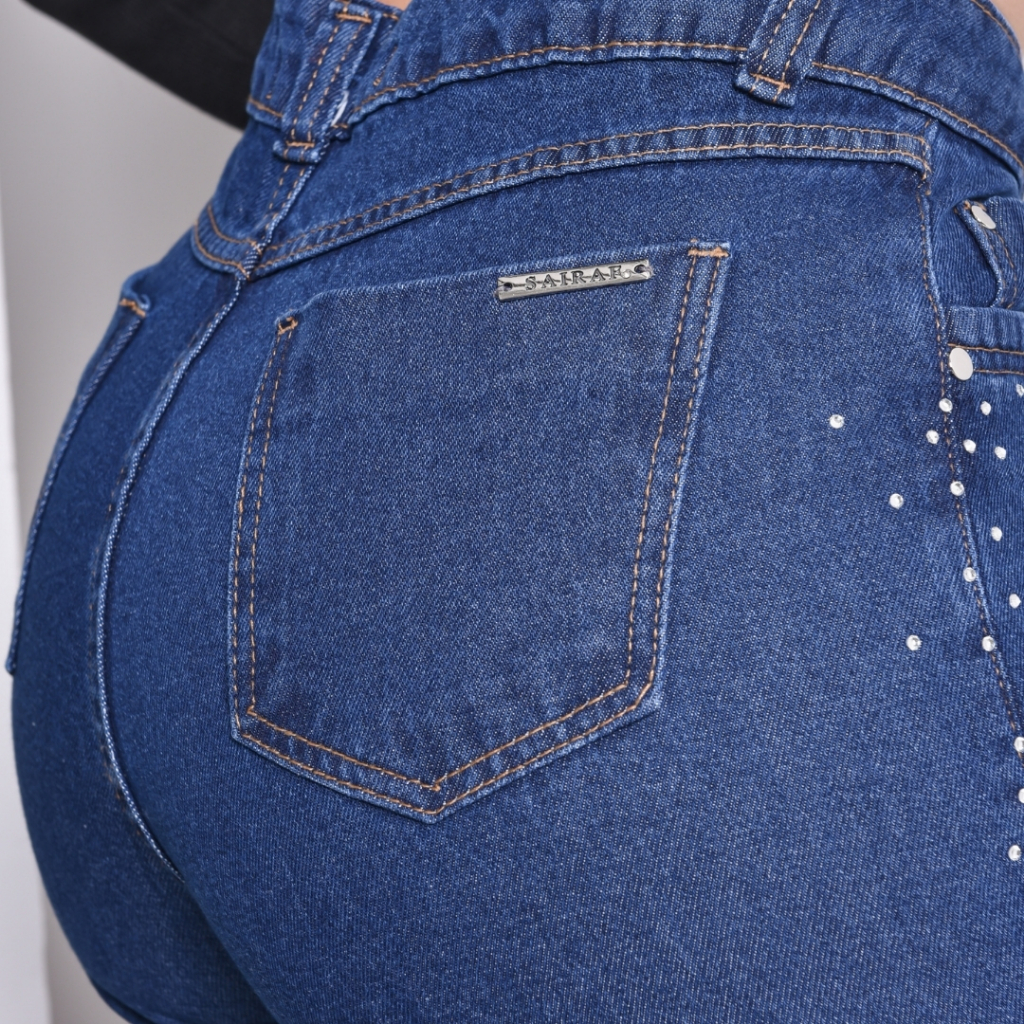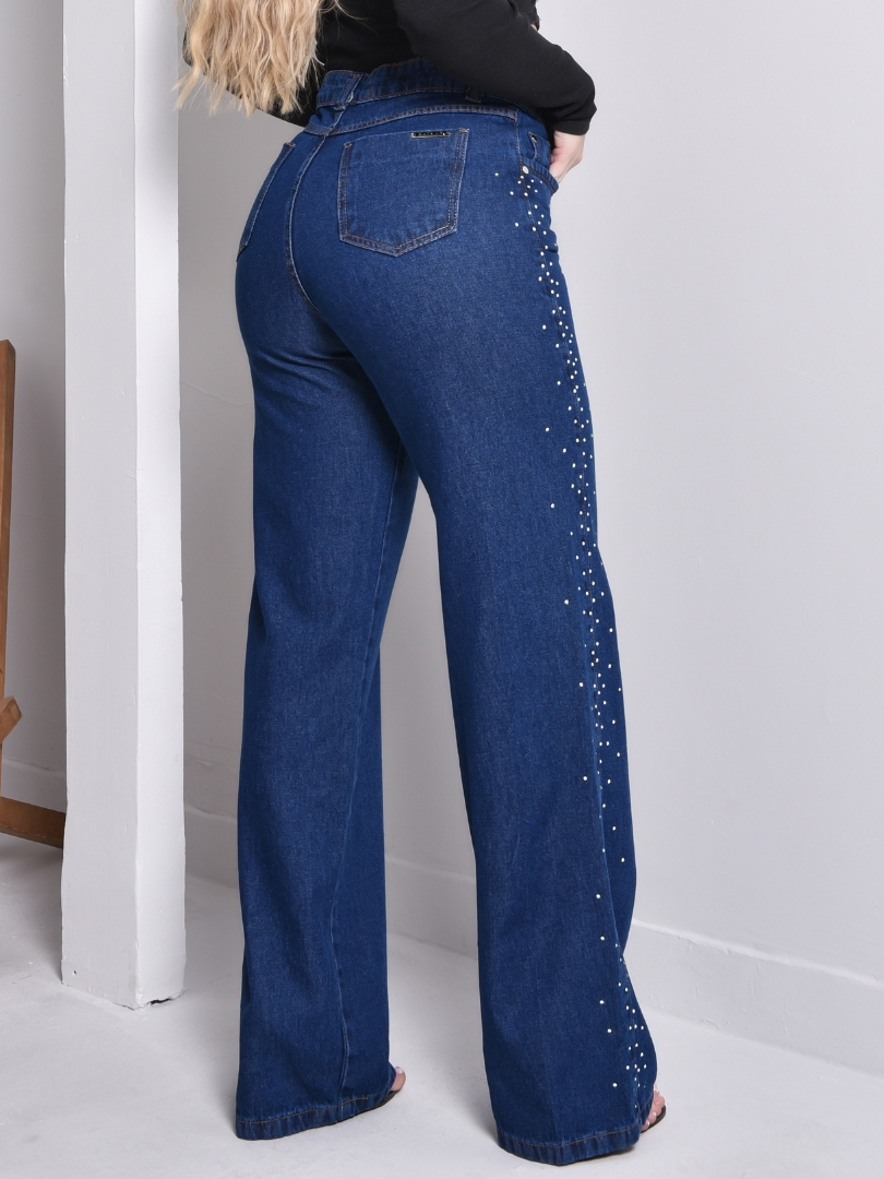 Calça Jeans Wide Leg Feminina Com Strass/Brilho Pantalona