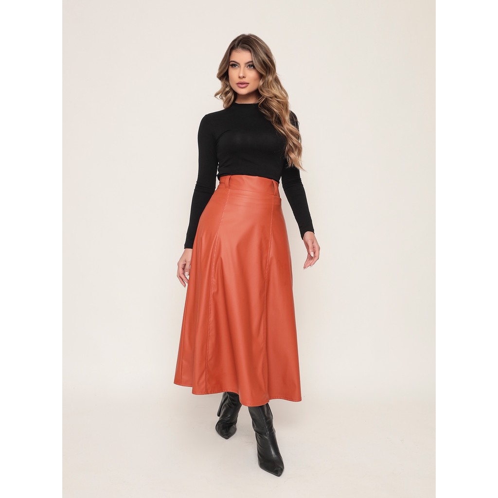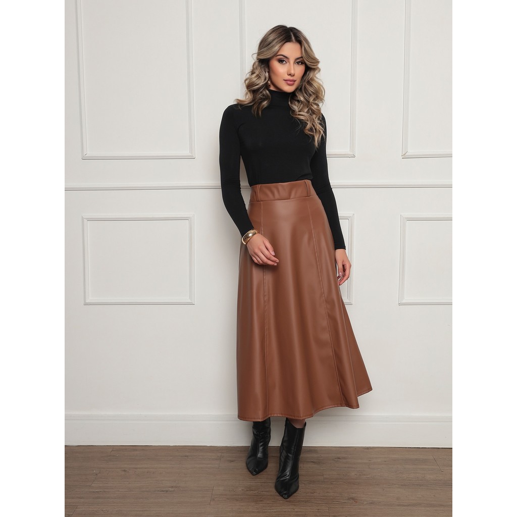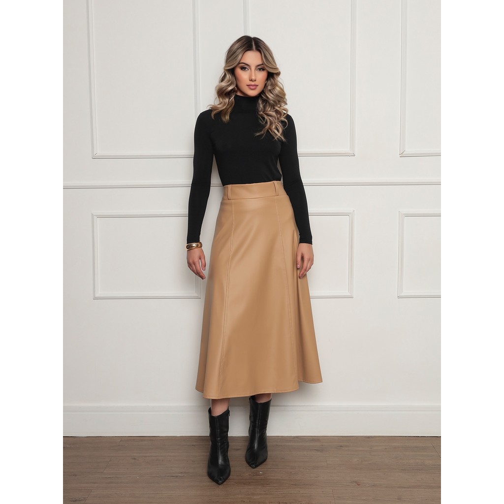 ONLYONE - SAIA MIDI EVASE CINTURA ALTA DELICADA EVANGÉLICA COURO FAKE SINTETICO COURINO