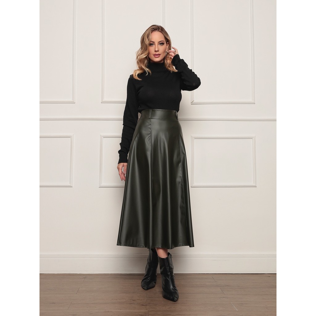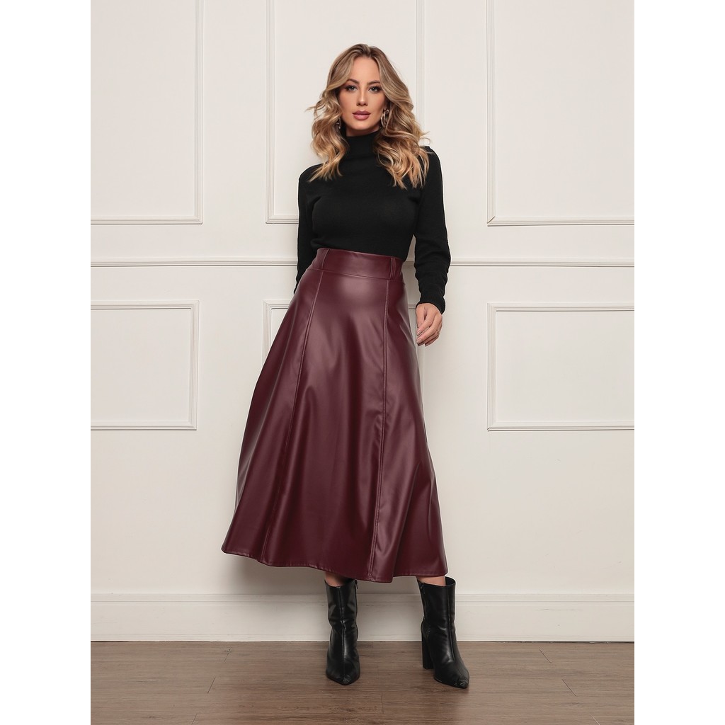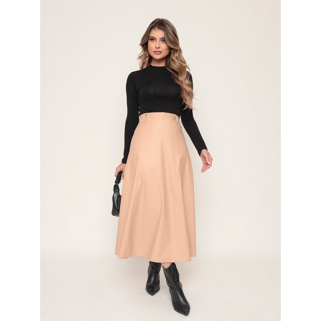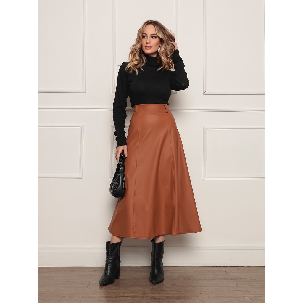 ONLYONE - SAIA MIDI EVASE CINTURA ALTA DELICADA EVANGÉLICA COURO FAKE SINTETICO COURINO