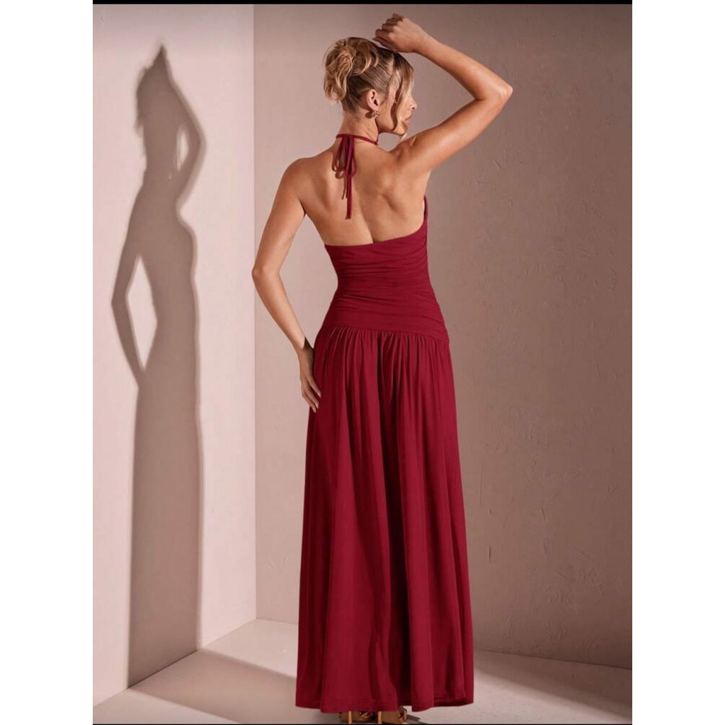Vestido feminino longo com fenda na perna com bojo amarração no pescoço com decote fashion 2025 duplo frontal na frente