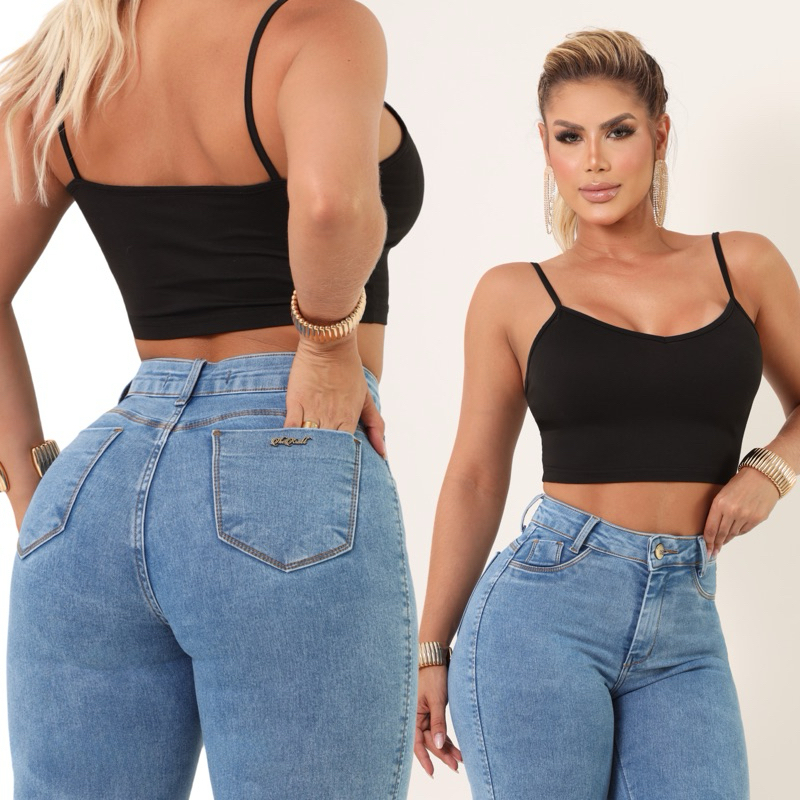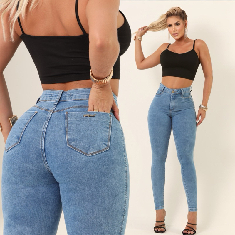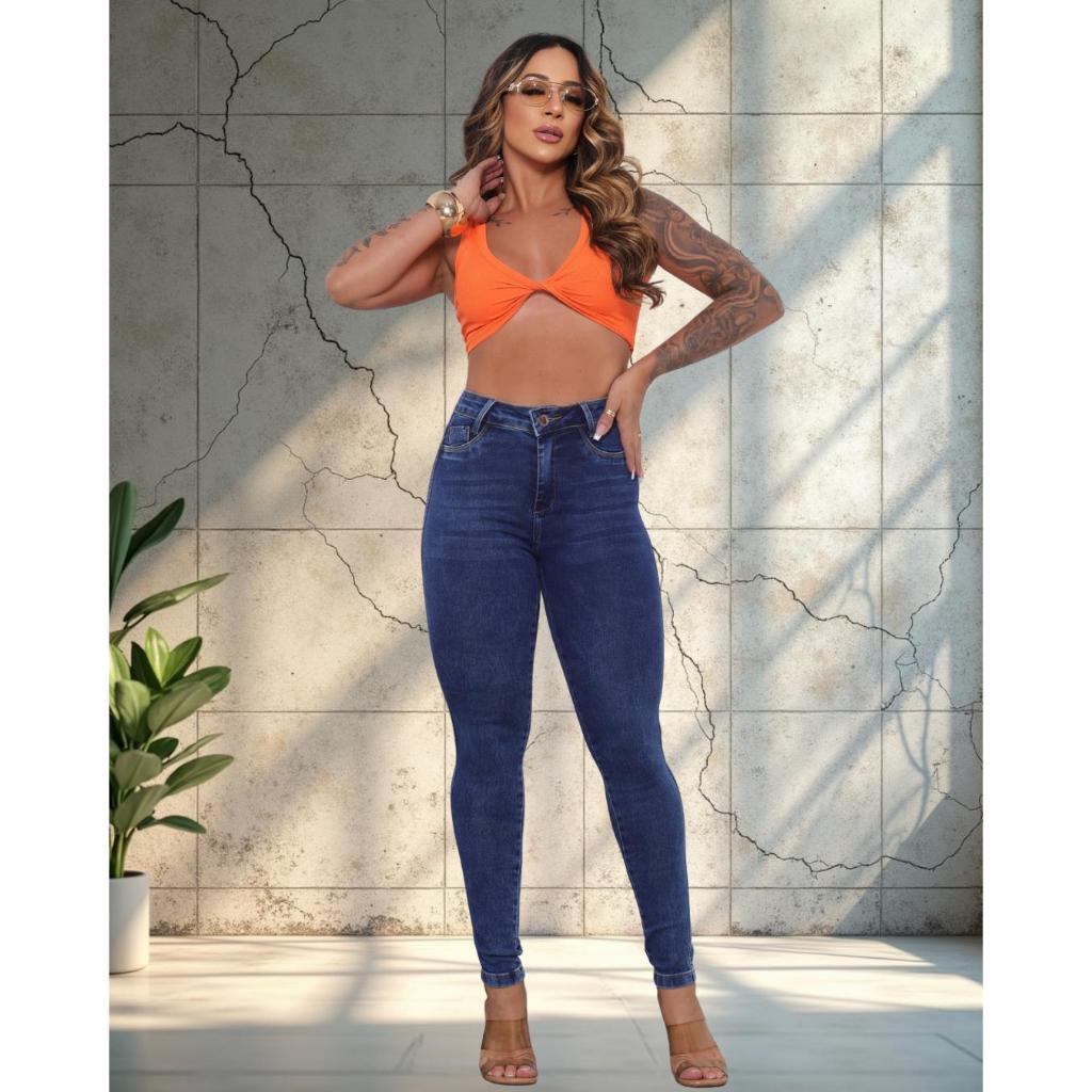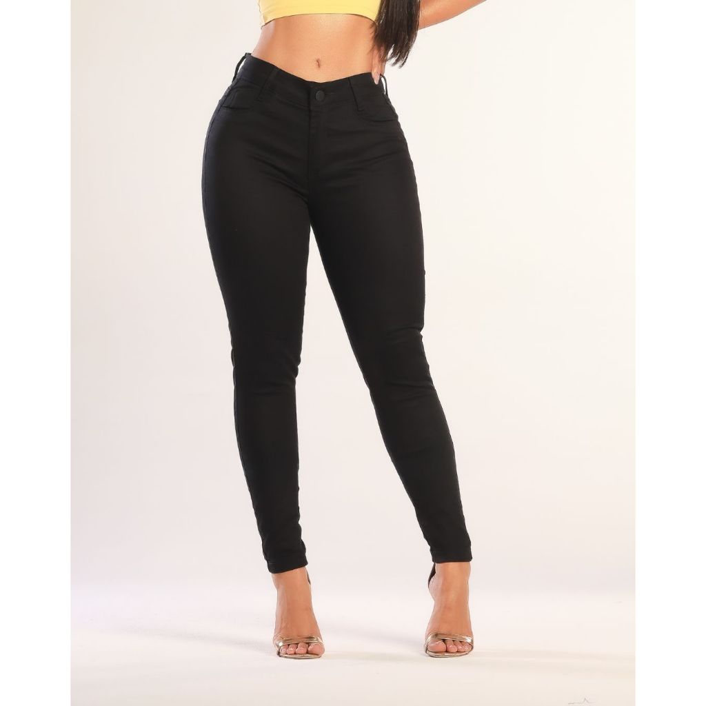 Calca Jeans Feminina Cintura Alta Elastano Skiny Clara , Escura , Amaciada e Preta