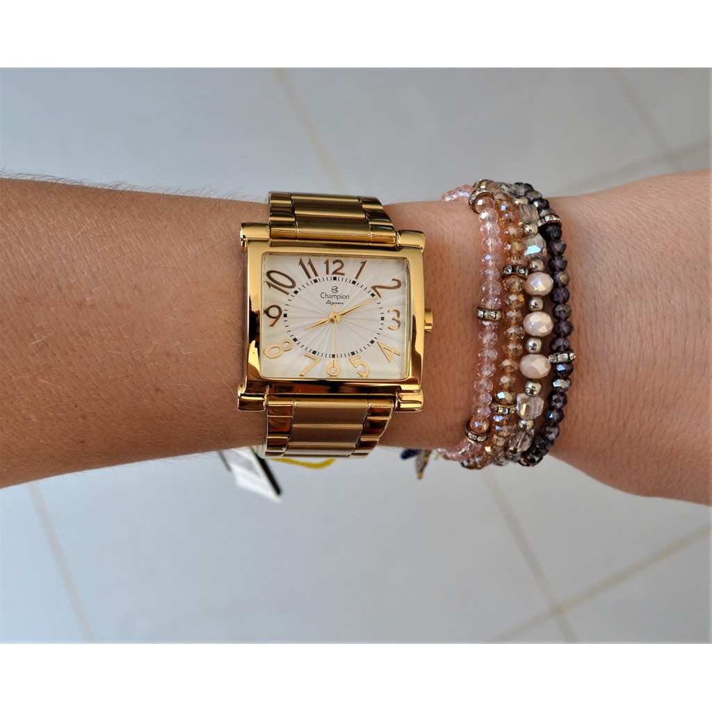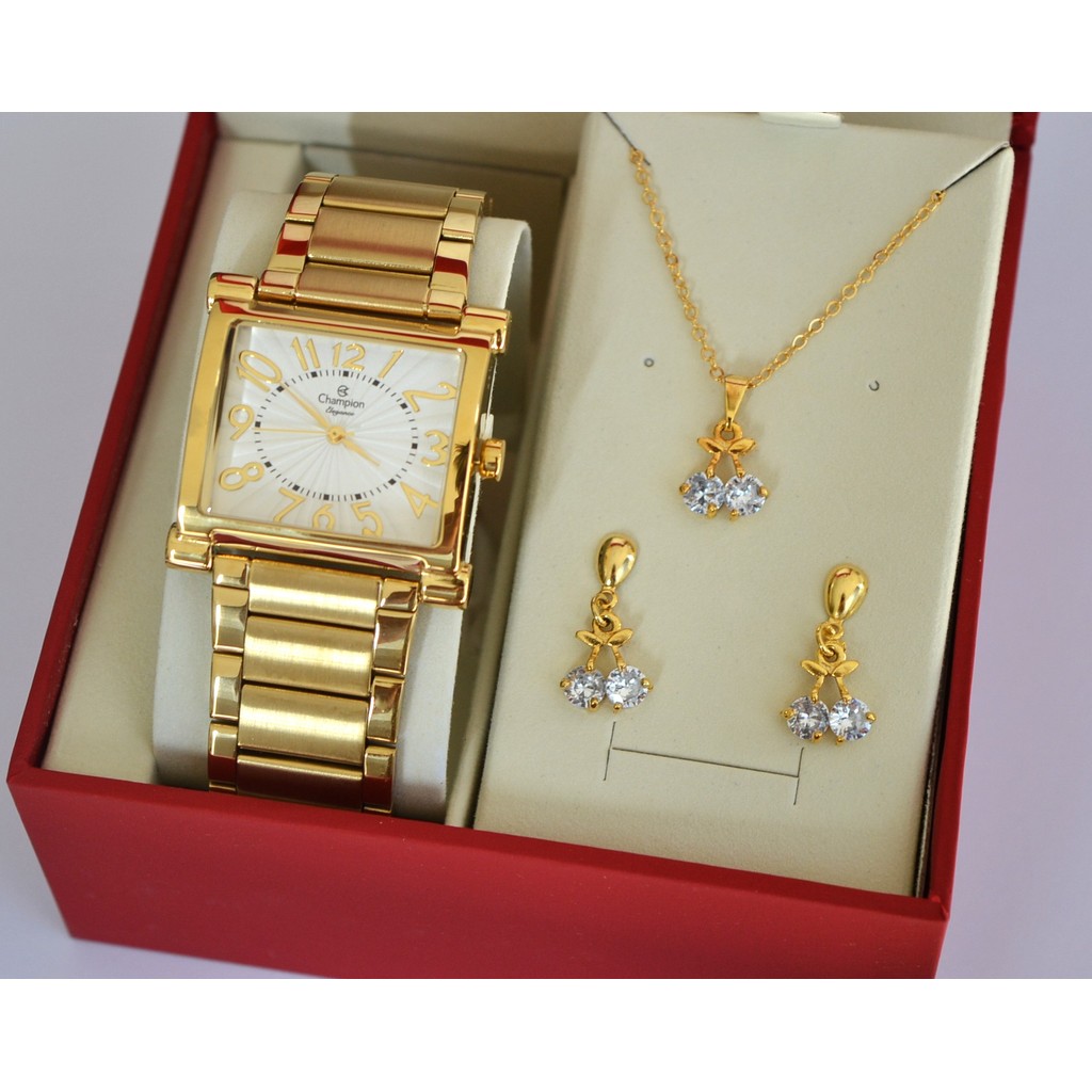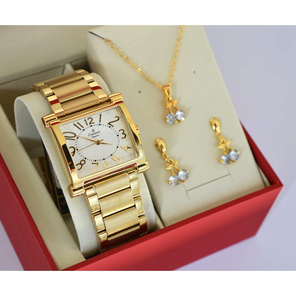 RELOGIO CHAMPION FEMININO QUADRADO DOURADO MEDIO NUMEROS CN26877H + KIT SEMI JOIA