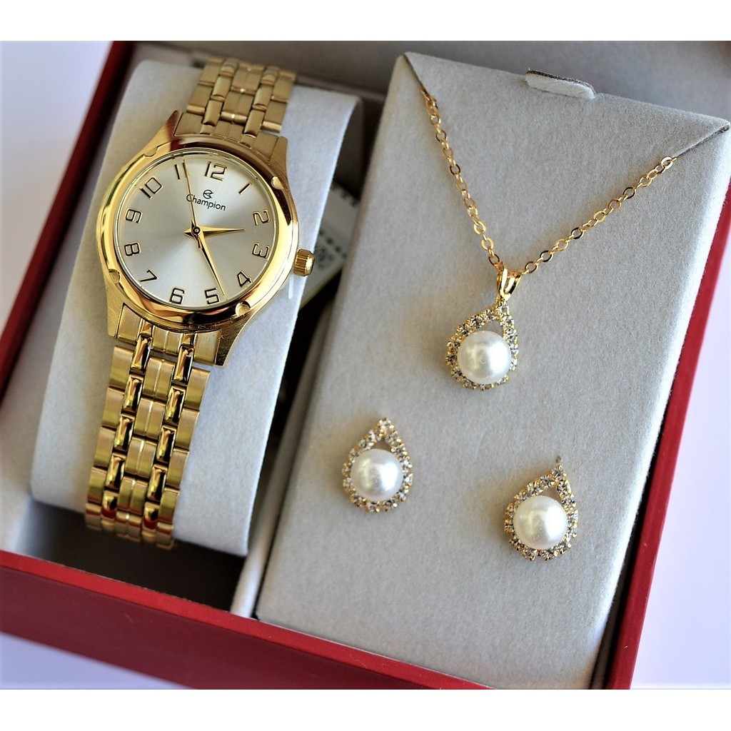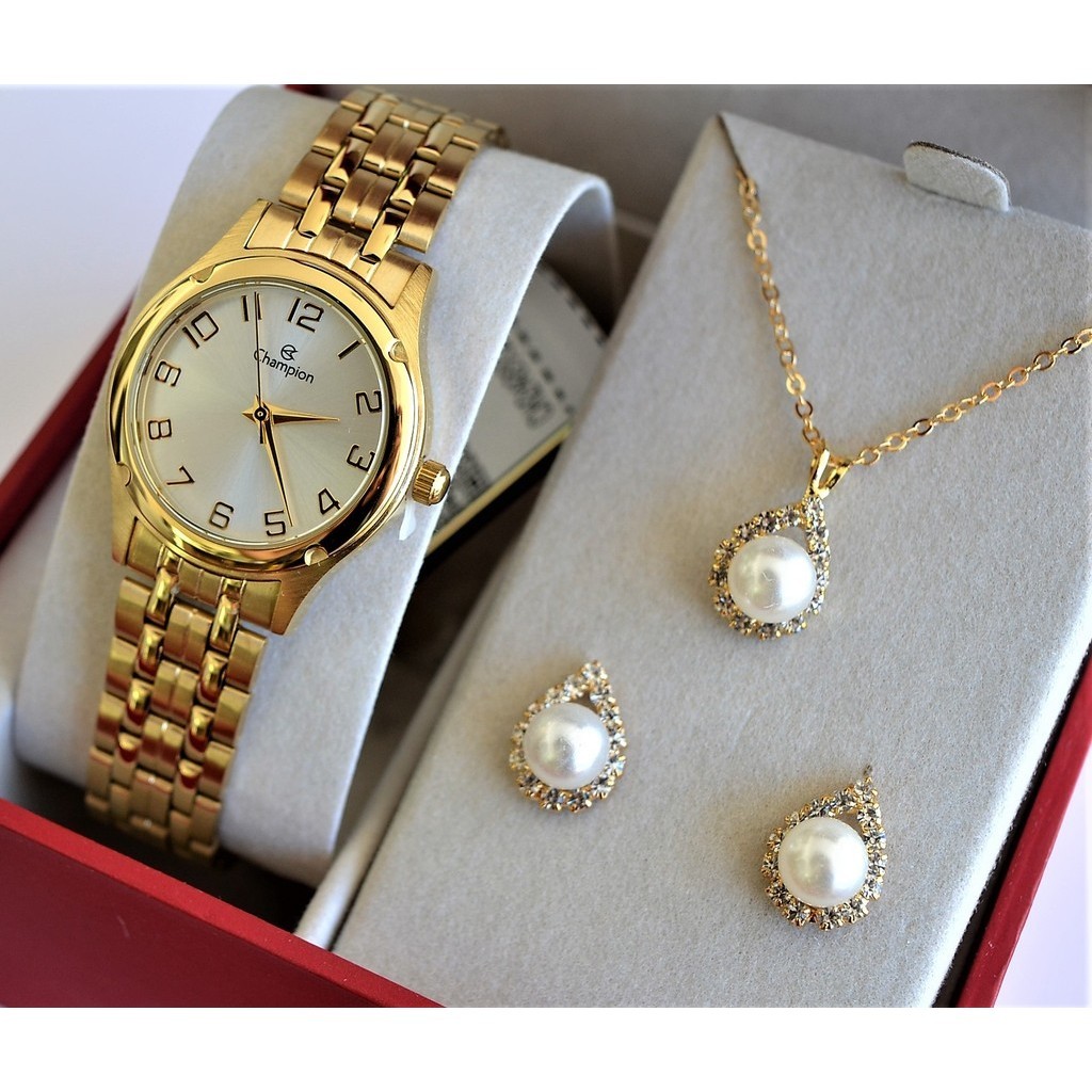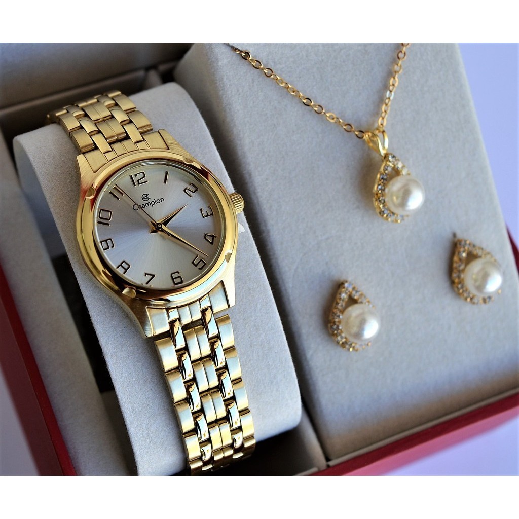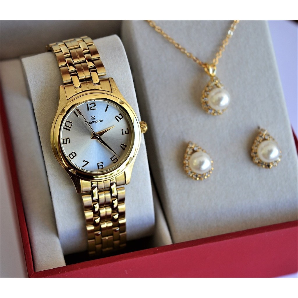 RELOGIO CHAMPION FEMININO DOURADO PEQUENO NUMEROS CH24893W + KIT SEMI JOIA