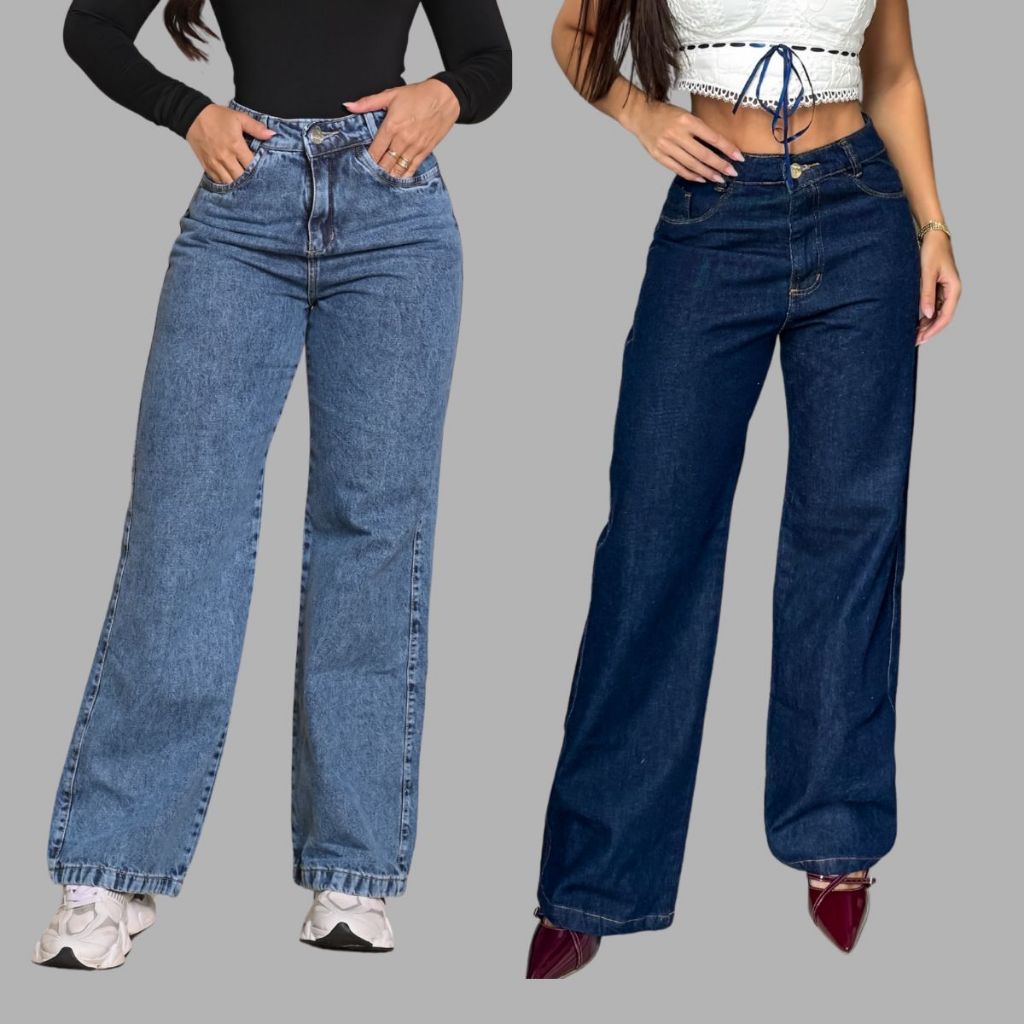 KIT Calça Jeans Feminina Wide Leg Marmorizada Cintura Alta Tecido Grosso Pantalona Premium 100% Algodão Levanta Bumbum