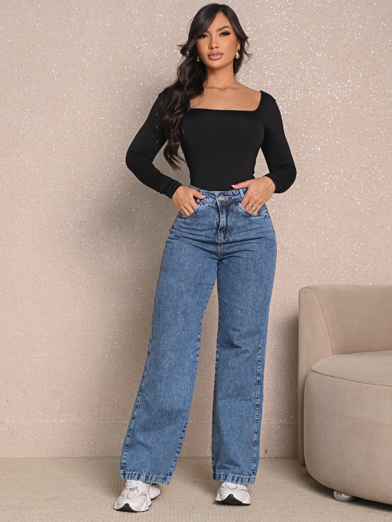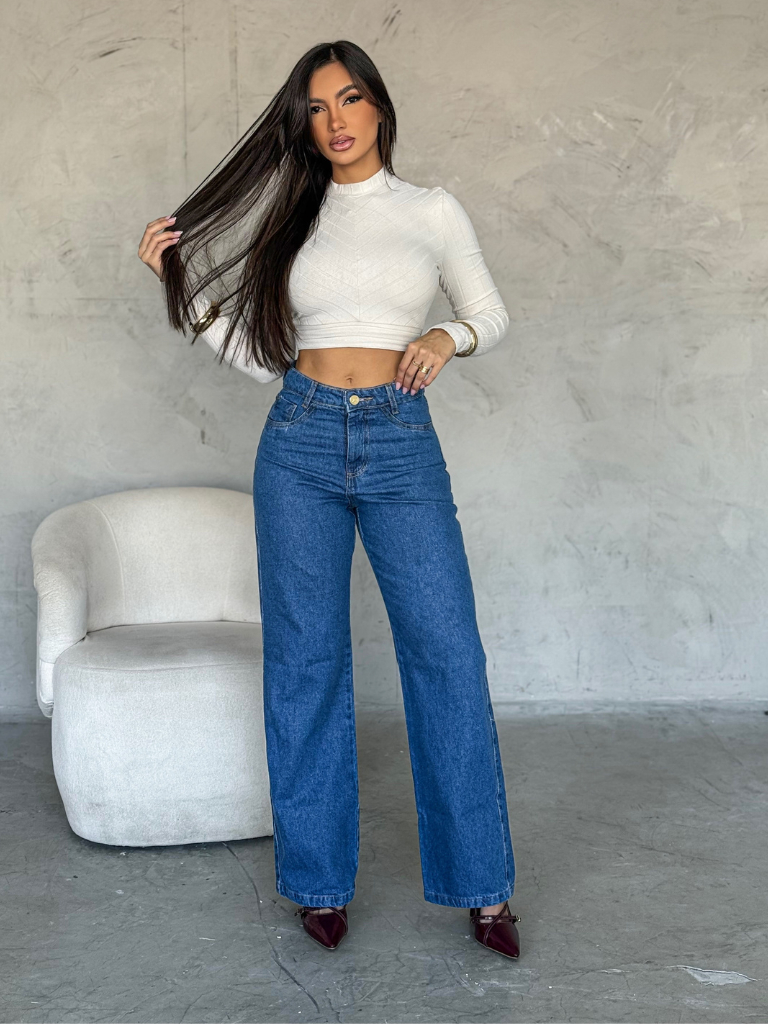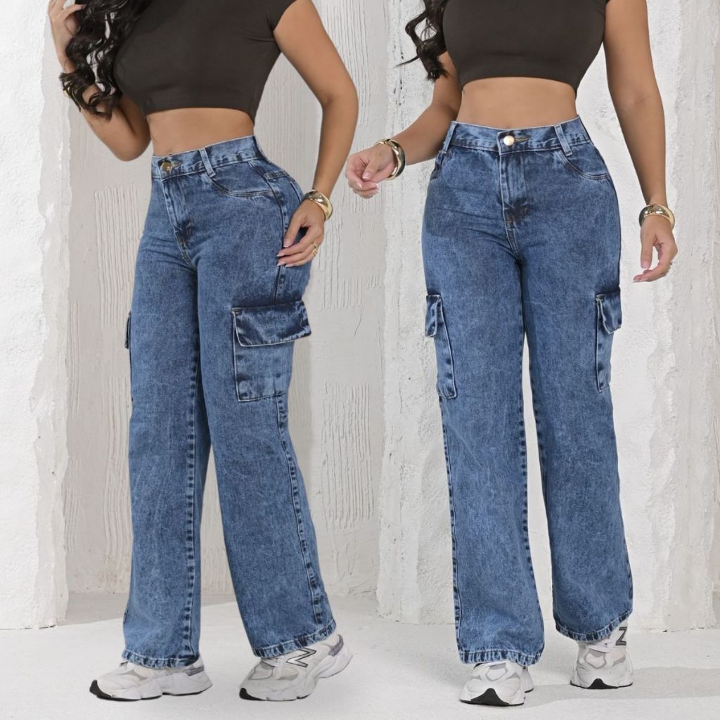 Calça Jeans Feminina Wide Leg Marmorizada Cintura Alta Tecido Grosso Pantalona Linha Premium 100% Algodão Levanta Bumbum