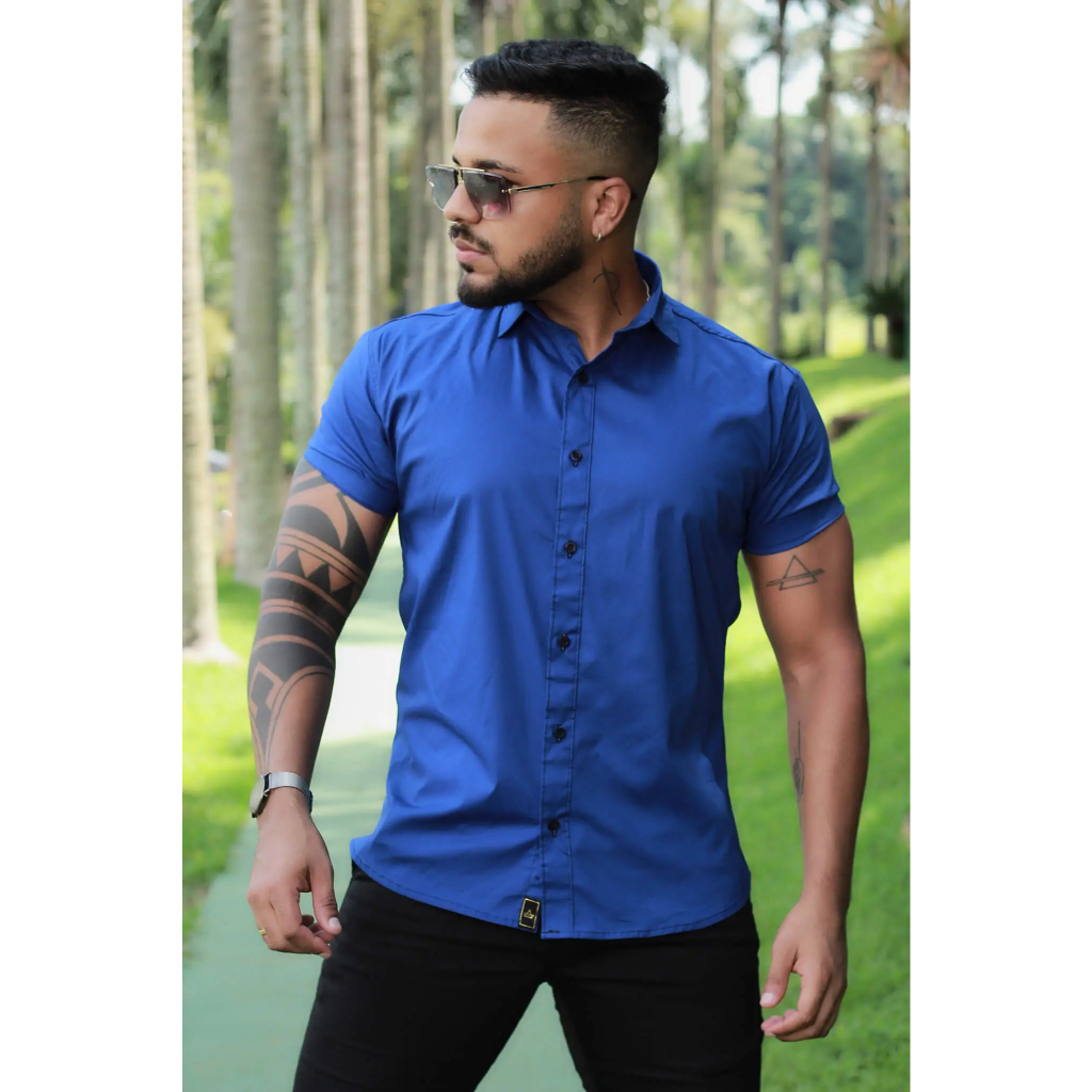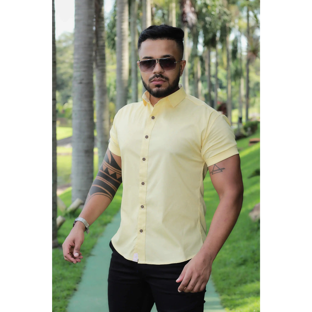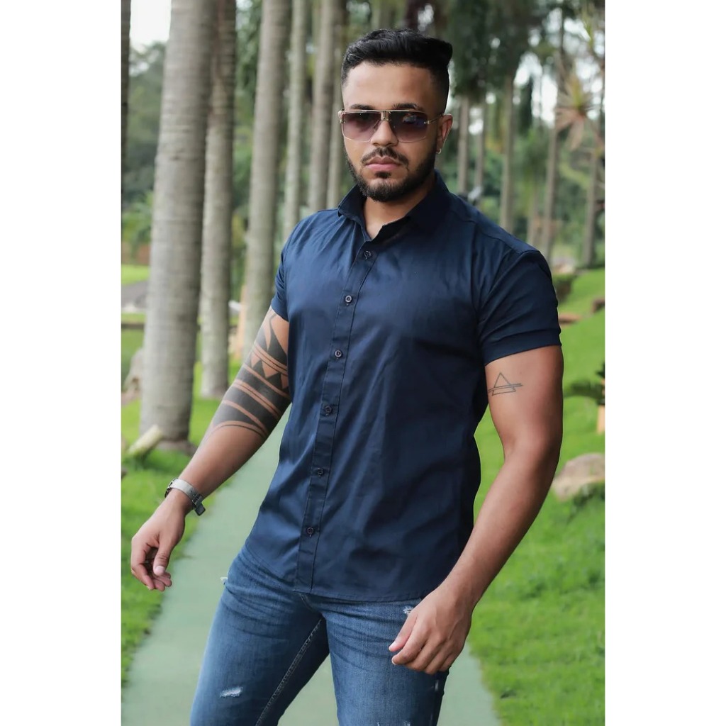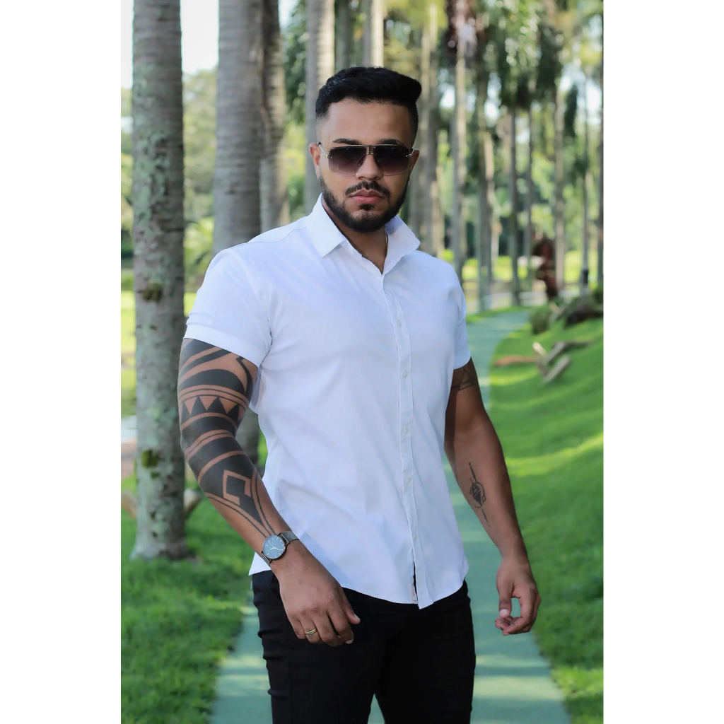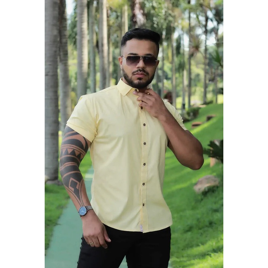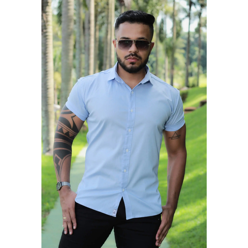 Camisa Masculina Social Lisa Manga Curta Mercerizada com Elastano Slim Fit Confortável e Elegante