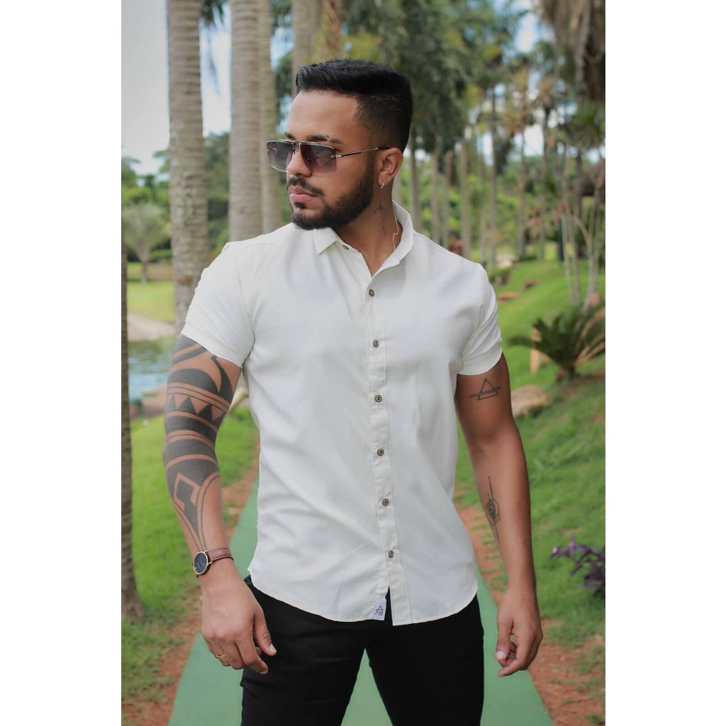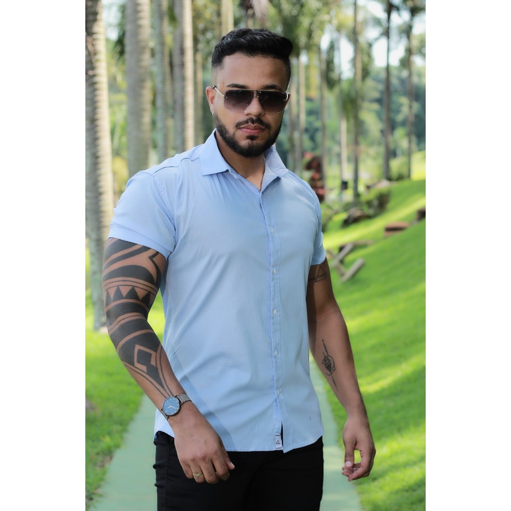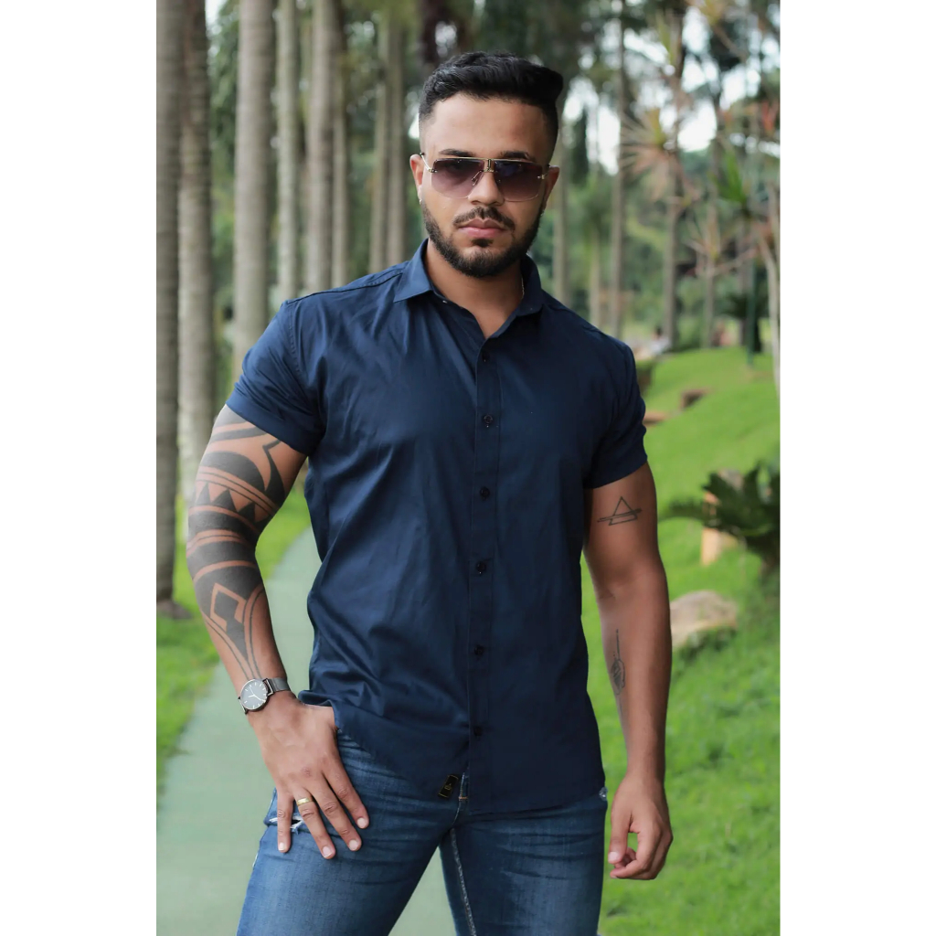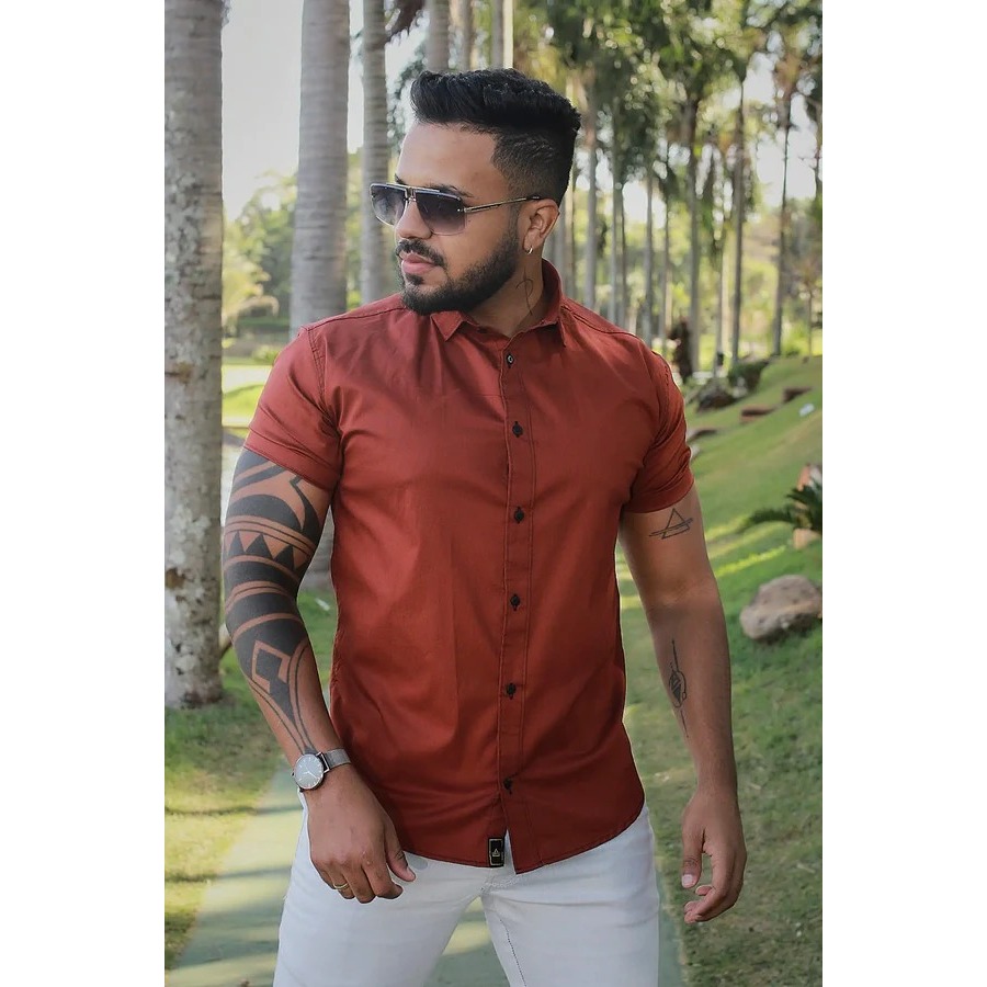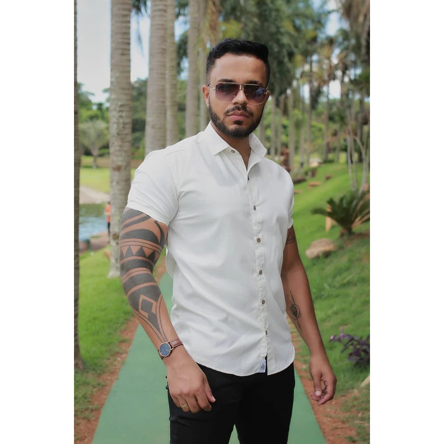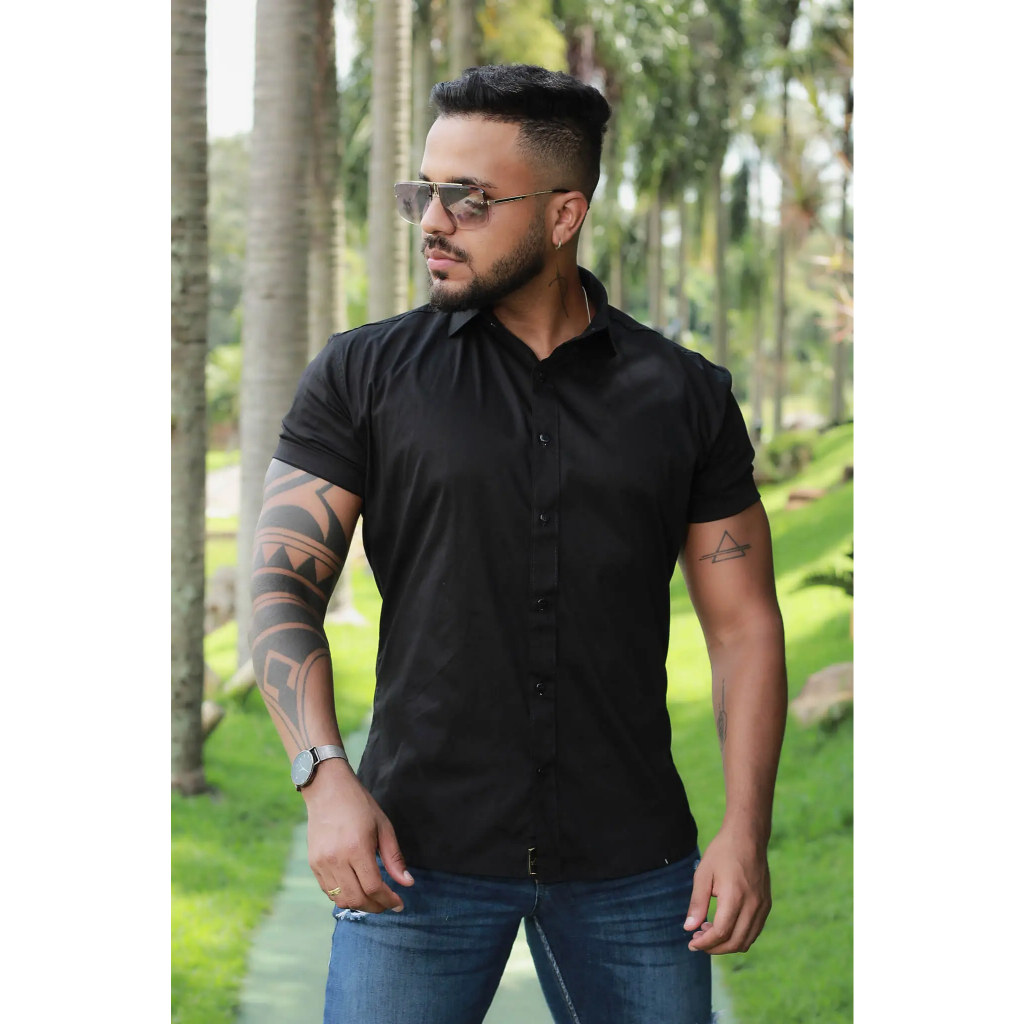 Camisa Masculina Social Lisa Manga Curta Mercerizada com Elastano Slim Fit Confortável e Elegante