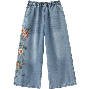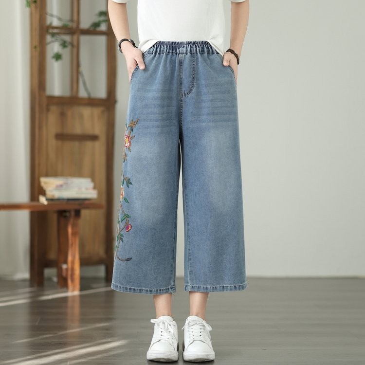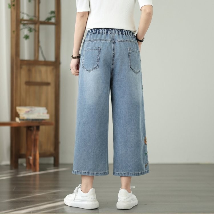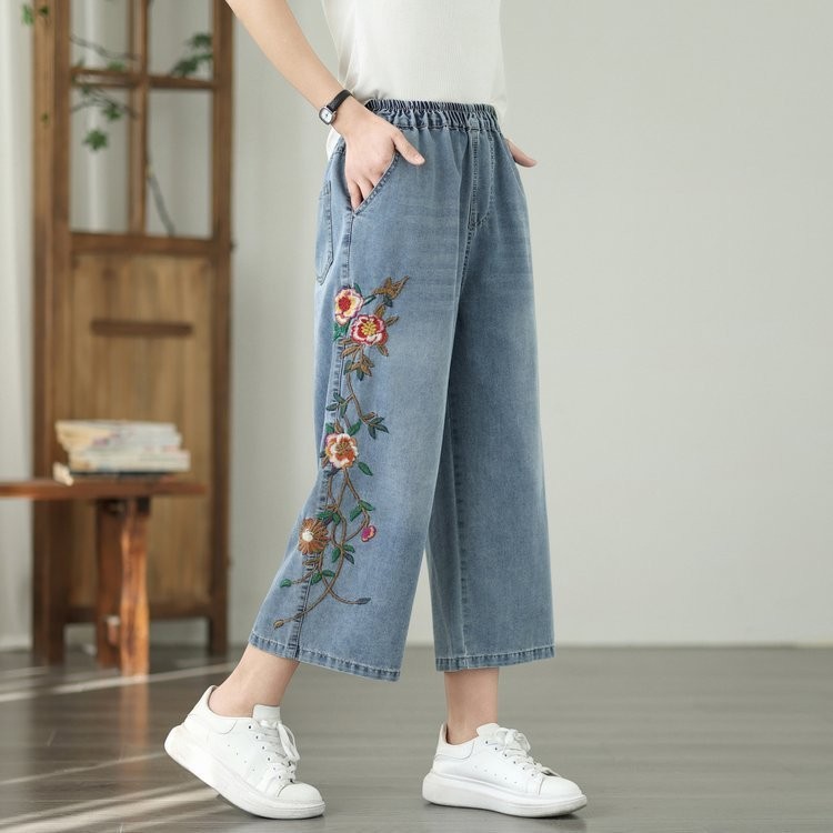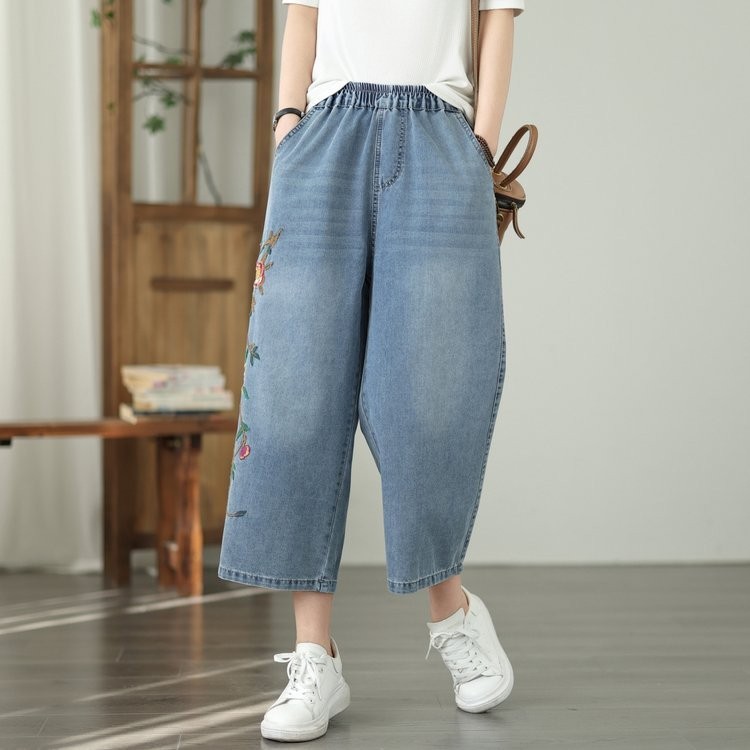 Apenas Faça bons produtos Real Shot Light Summer Jeans Mulheres Literário Casual Bordado Calças Cortadas de Alta Qualida