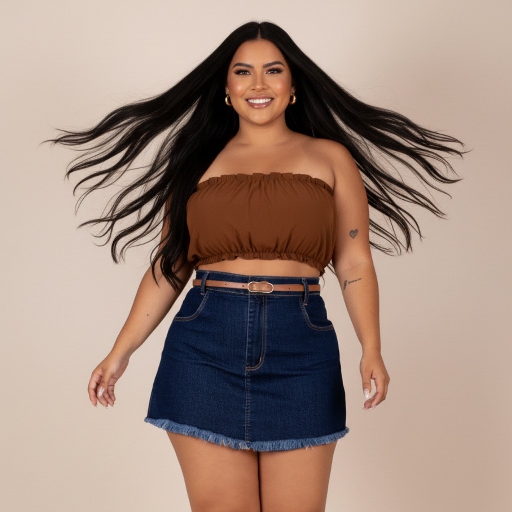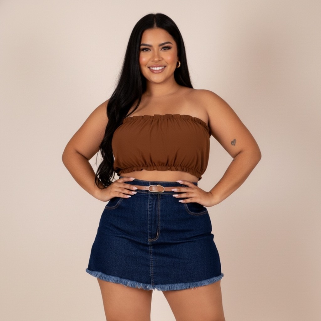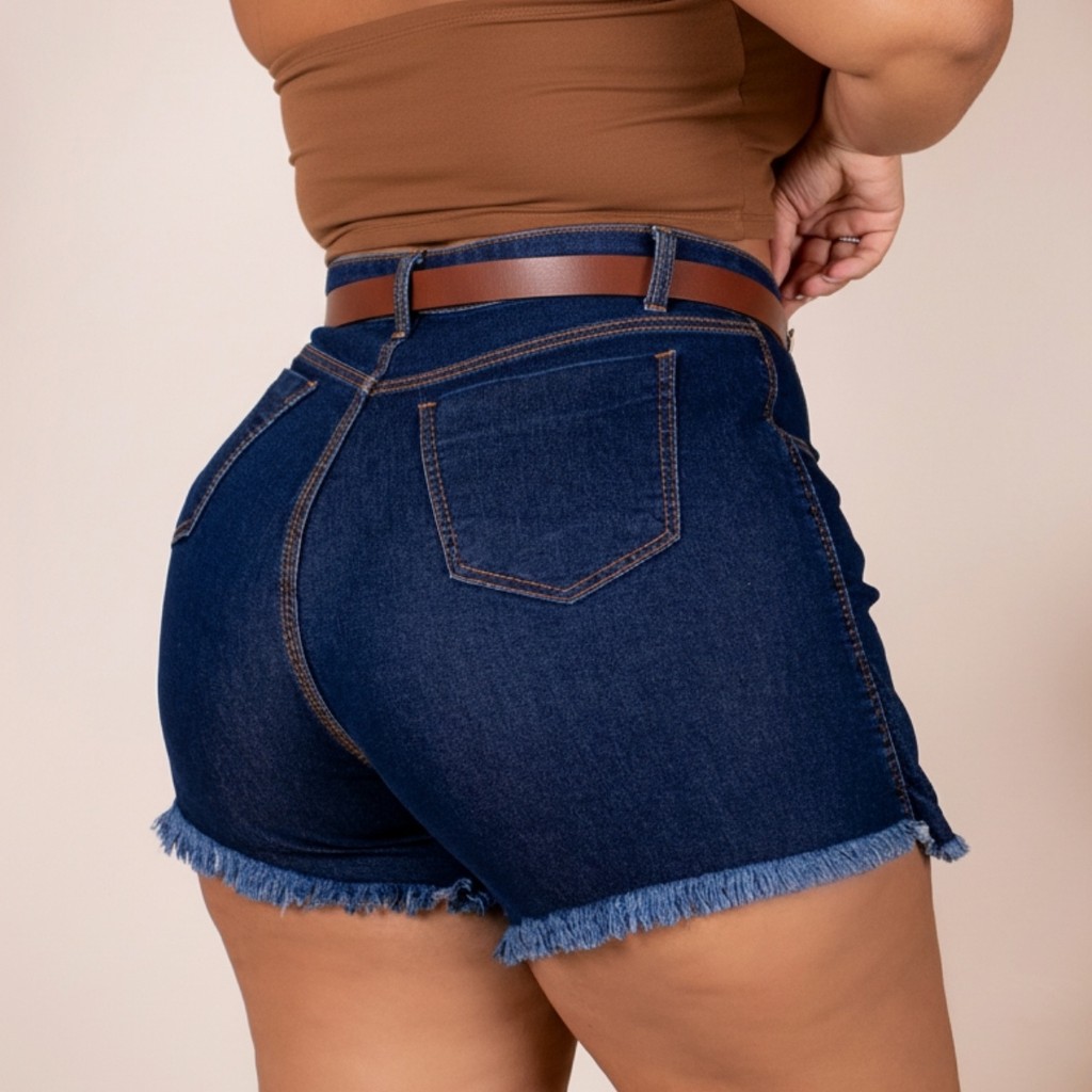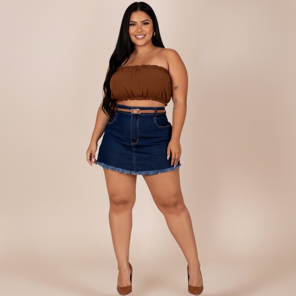 Short Saia Jeans Plus Size Cintura Alta Barra Desfiada Cinto