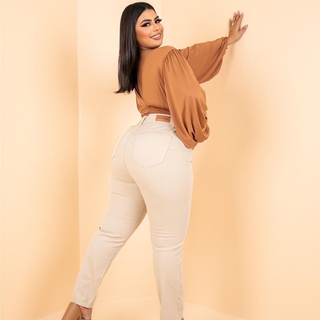 Calça Mom Jeans Plus Size Bege Cintura Alta Arrumada