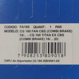 PASTILHA DE FREIO DIANT. TITAN/FAN 160 2018 2019 2020 2021 2022 2023 2024 - ( CBS )