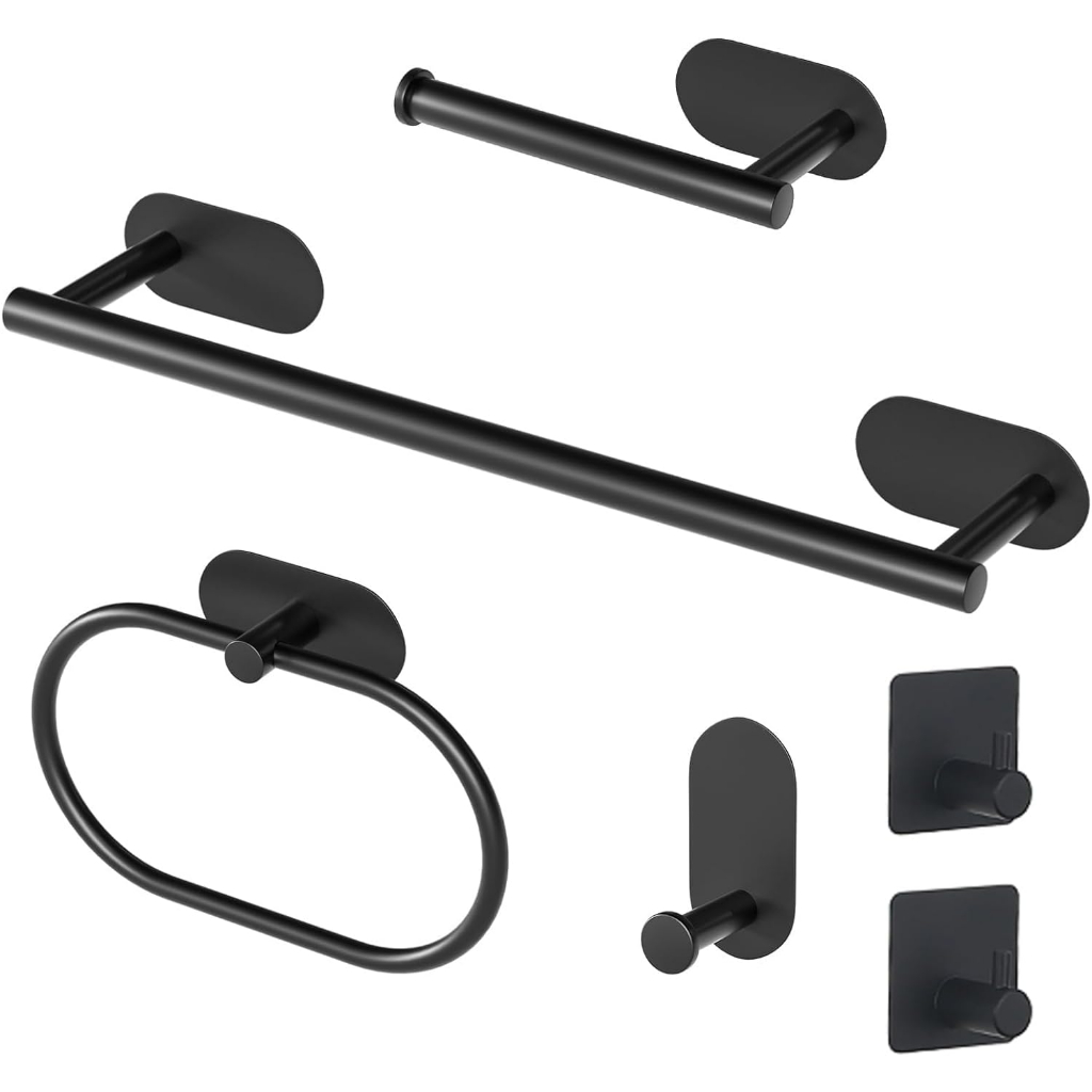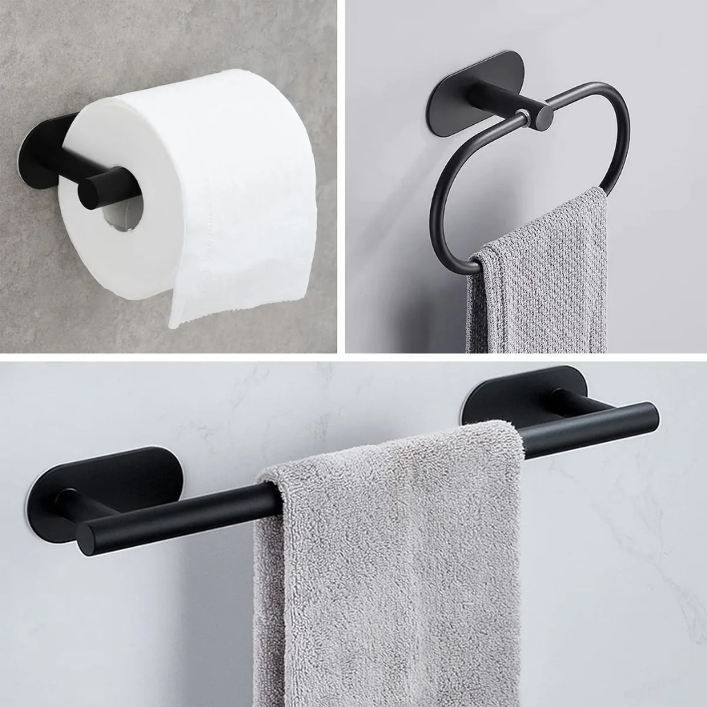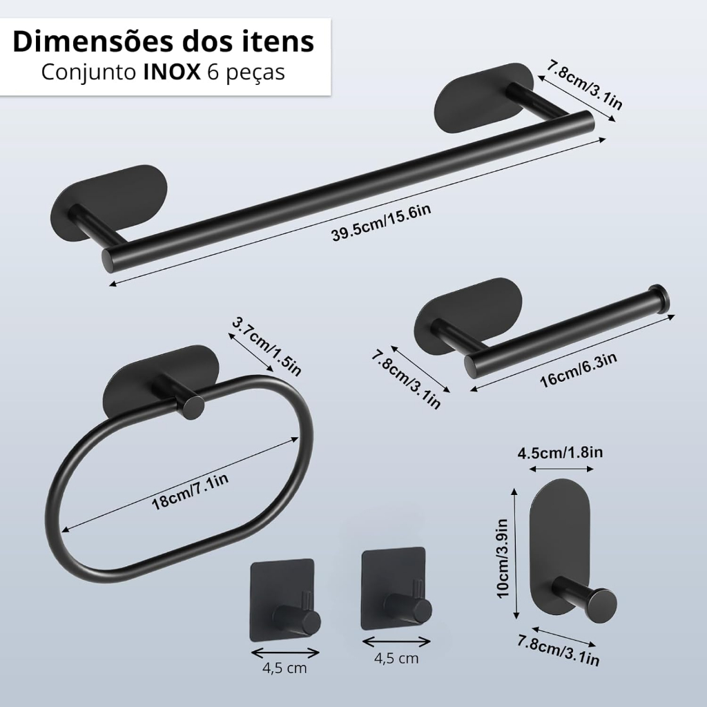 Kit Acessórios Banheiro Inox 304 6 Peças Sem Furo (Fixação 3M) - Toalheiro, Porta Papel e Ganchos