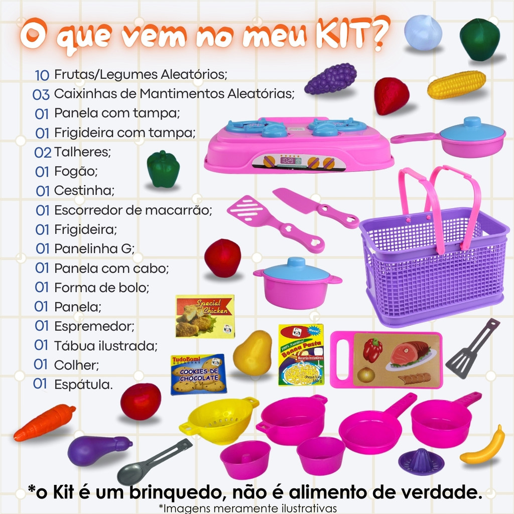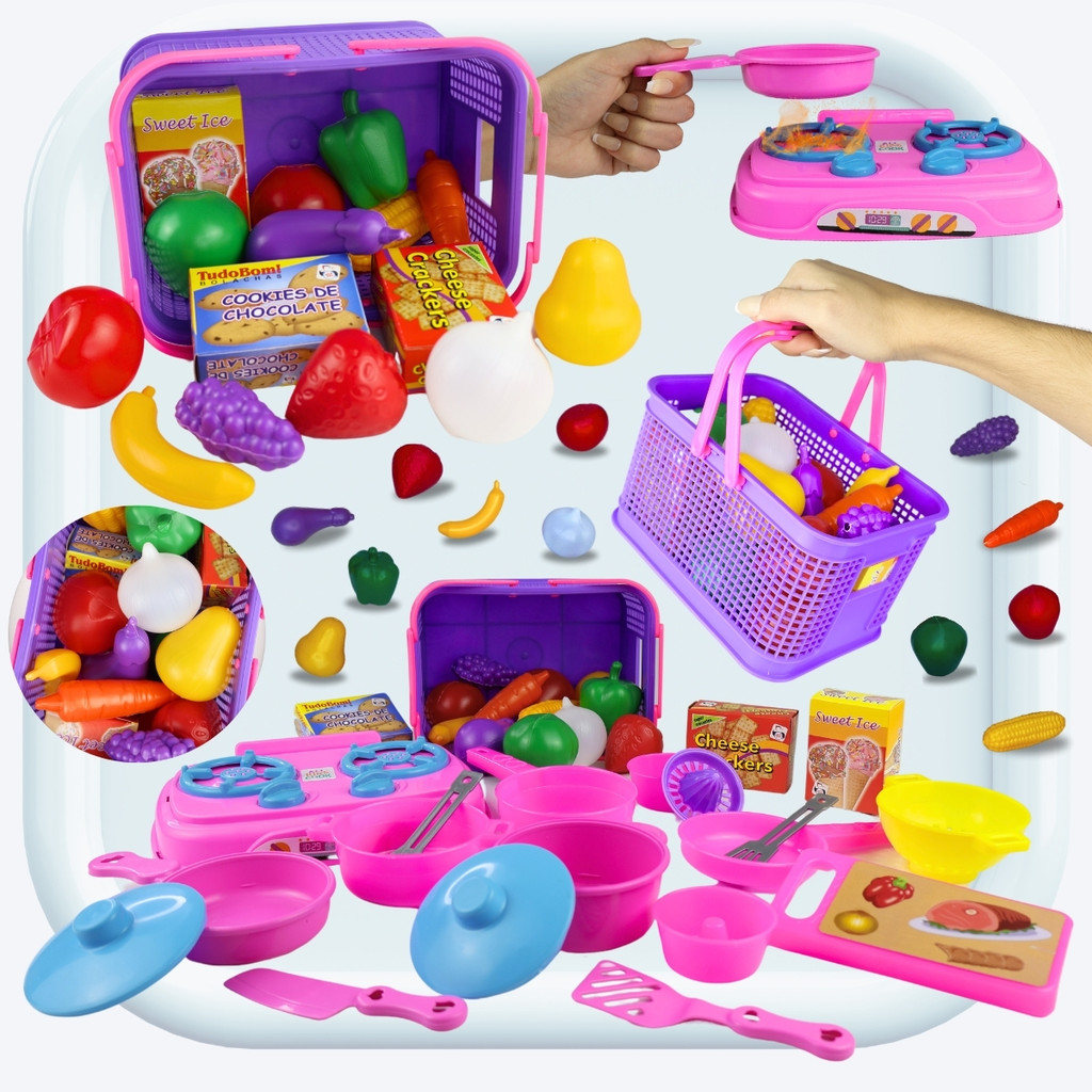 Kit Cozinha Infantil Brinquedo Fogão + Cesta Frutas Legumes