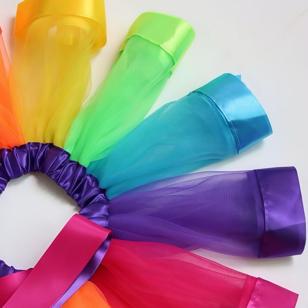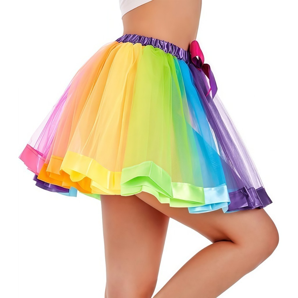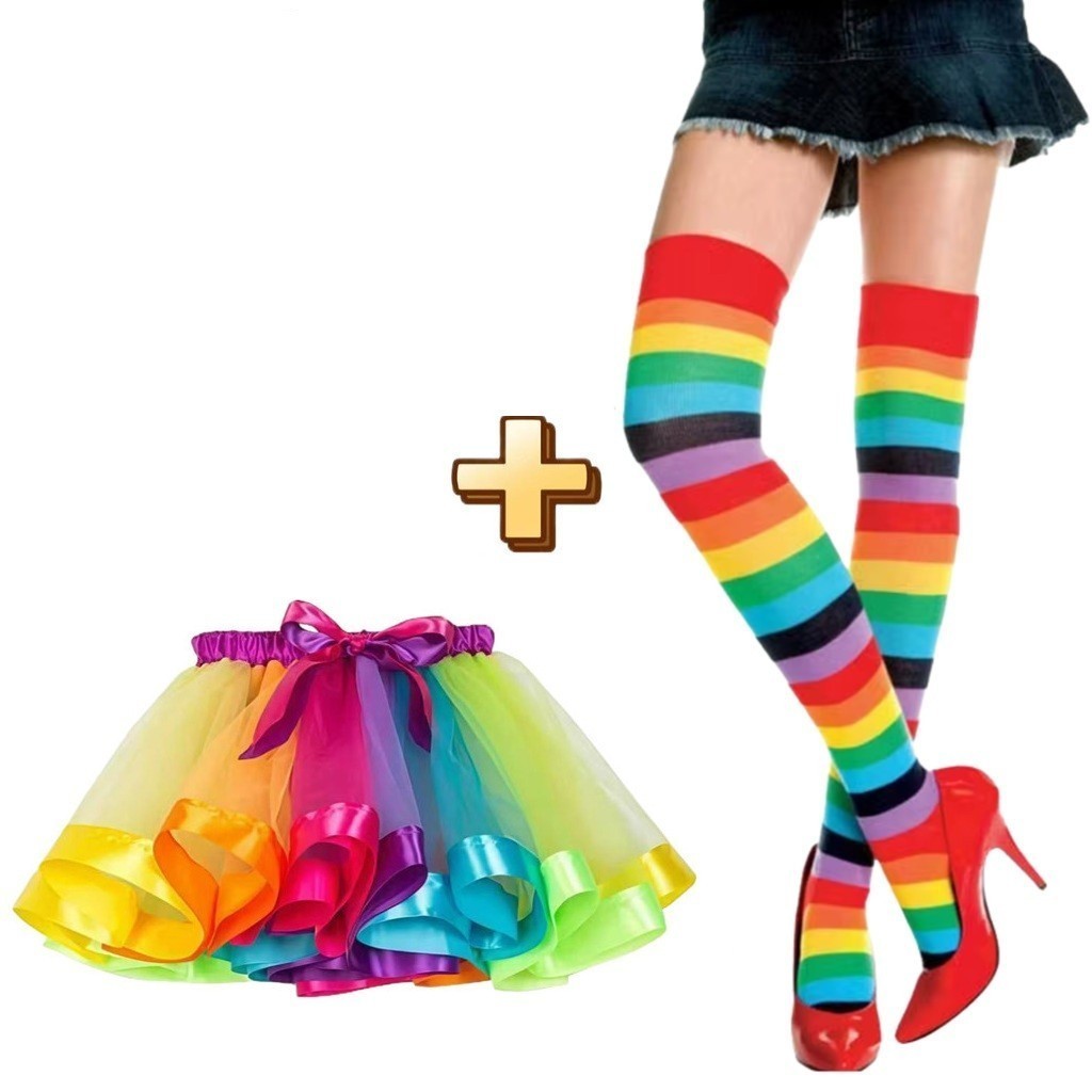 Conjunto Saia/Luva/Meia Saia Tule Arco-Íris Adulto - Colorida 40cm Carnaval Festas Cintura Elástica