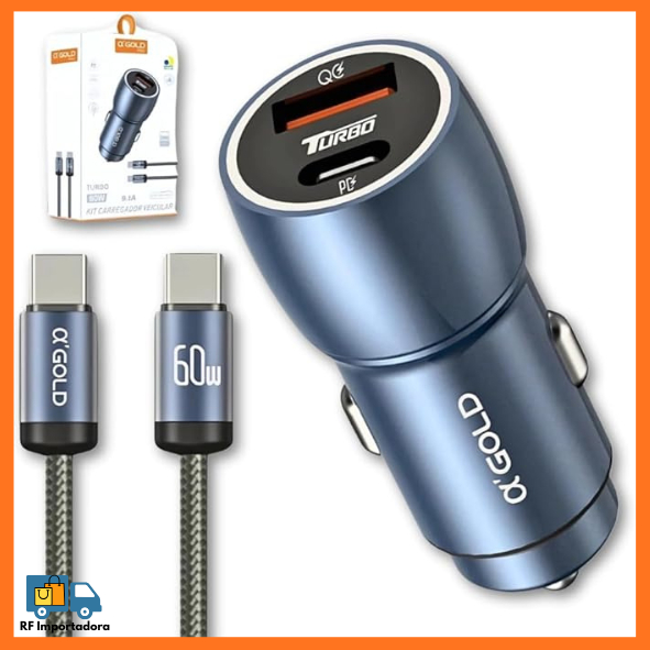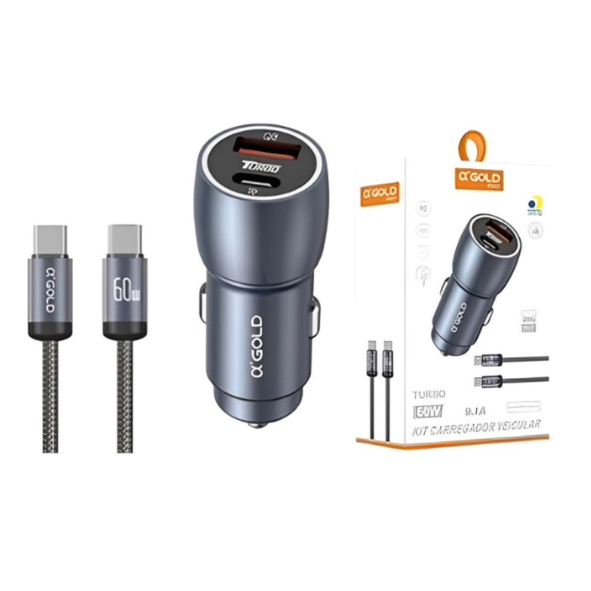 Kit Carregador Veícular 60W Turbo PD + USB-C Com Cabo Tipo-C/Tipo-C Para iPhone e Android A'gold