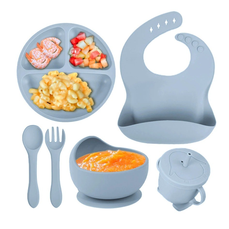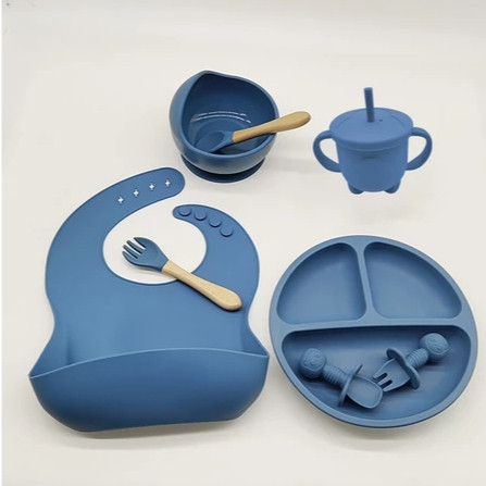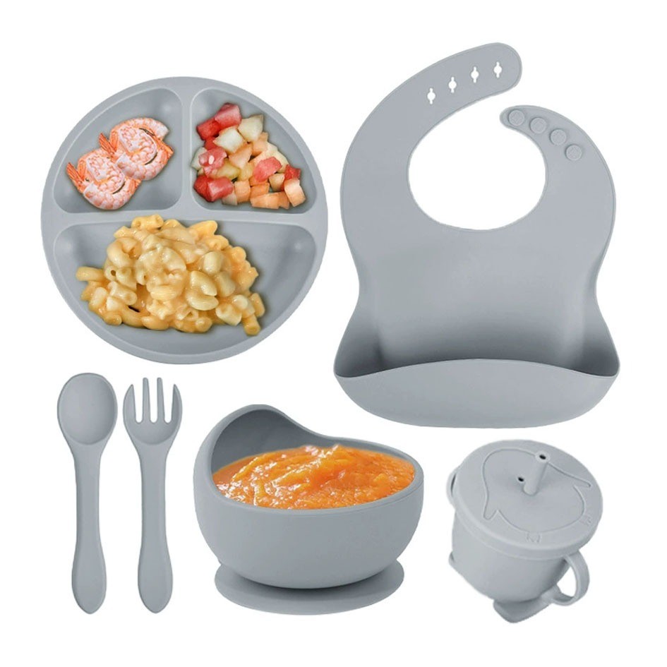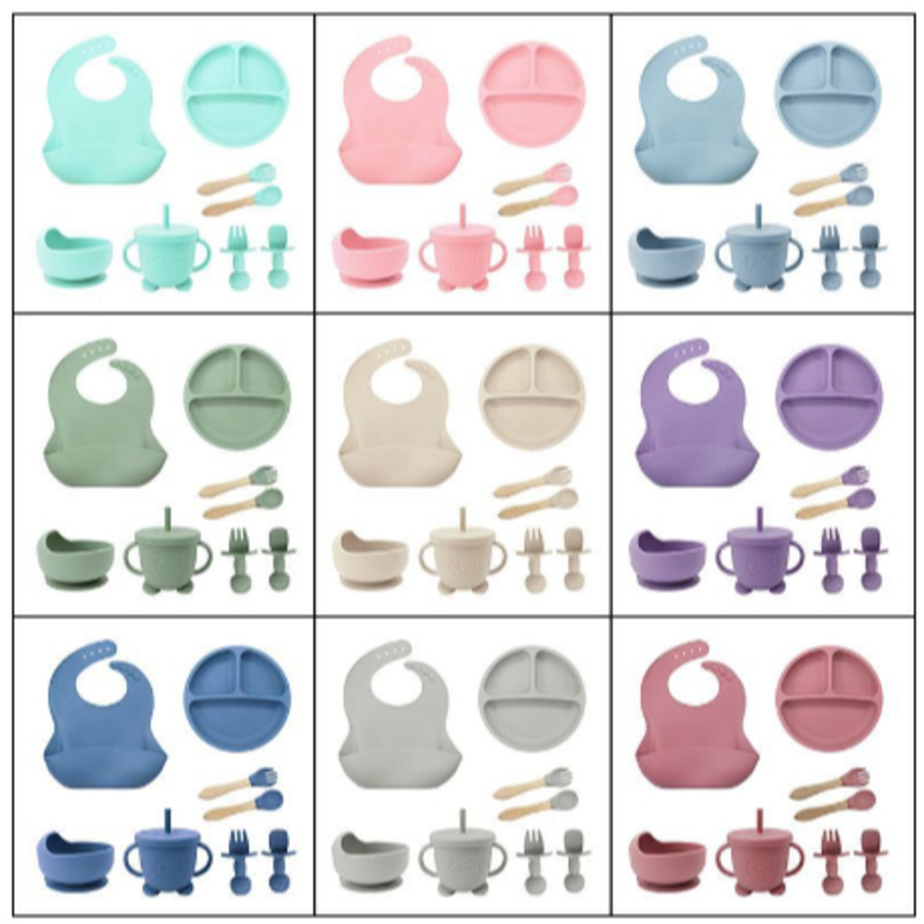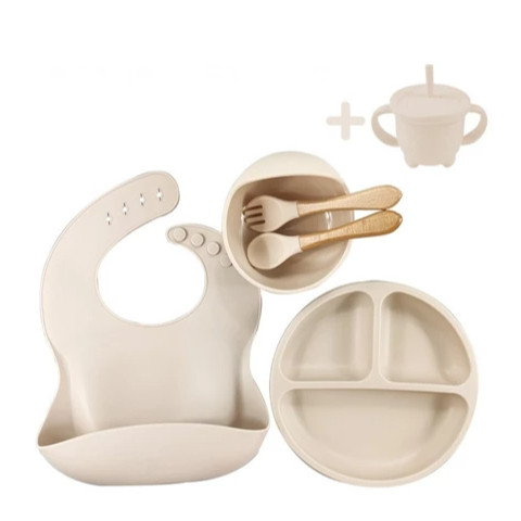 Kit Talheres bebê silicone 4/6/8 Peças Talheres Infantil Com Ventosa Canudo Colher Babador Garfo