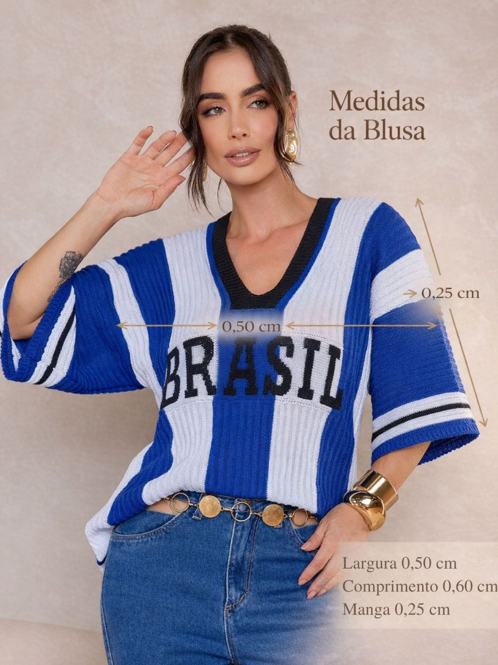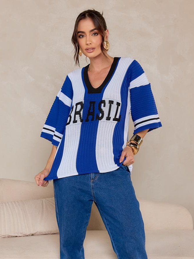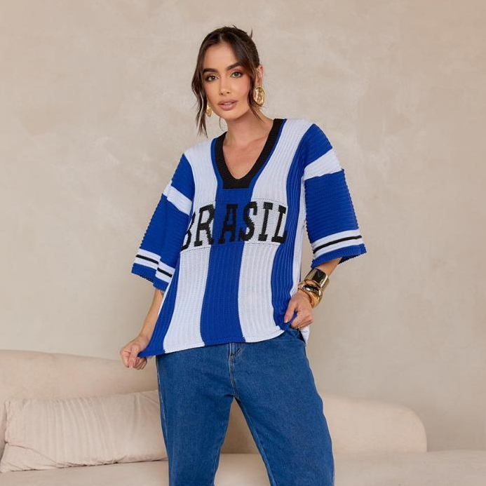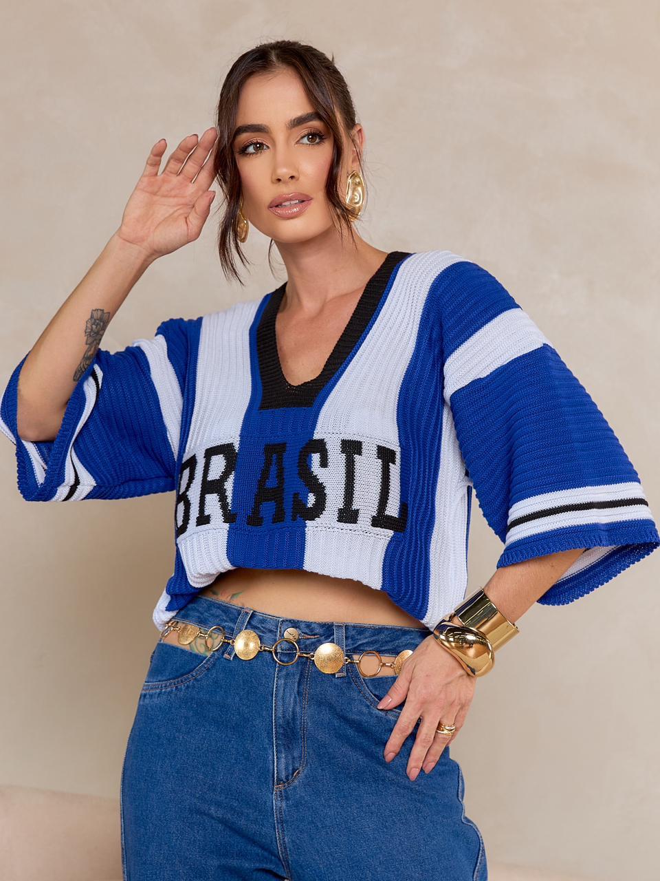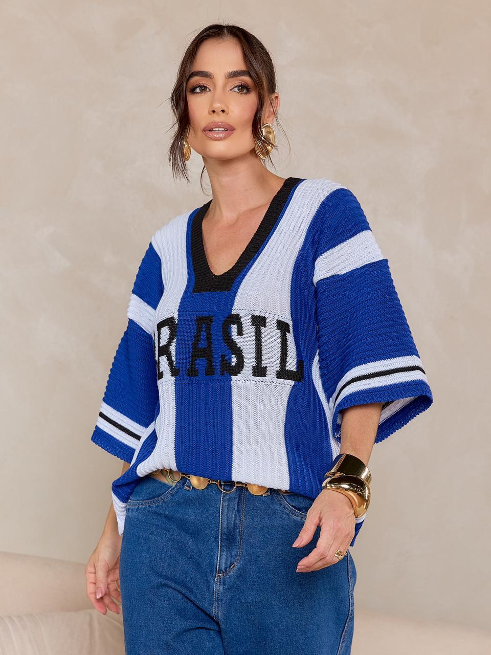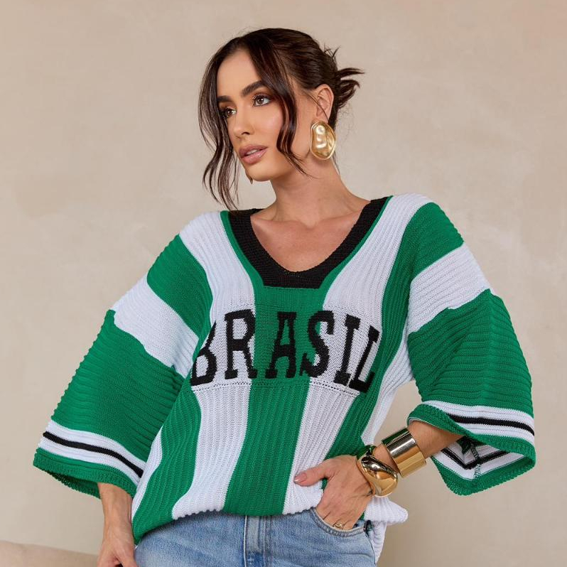 Blusa Tricot Brasil Feminina Manga Ampla Decote V Confortável Premium