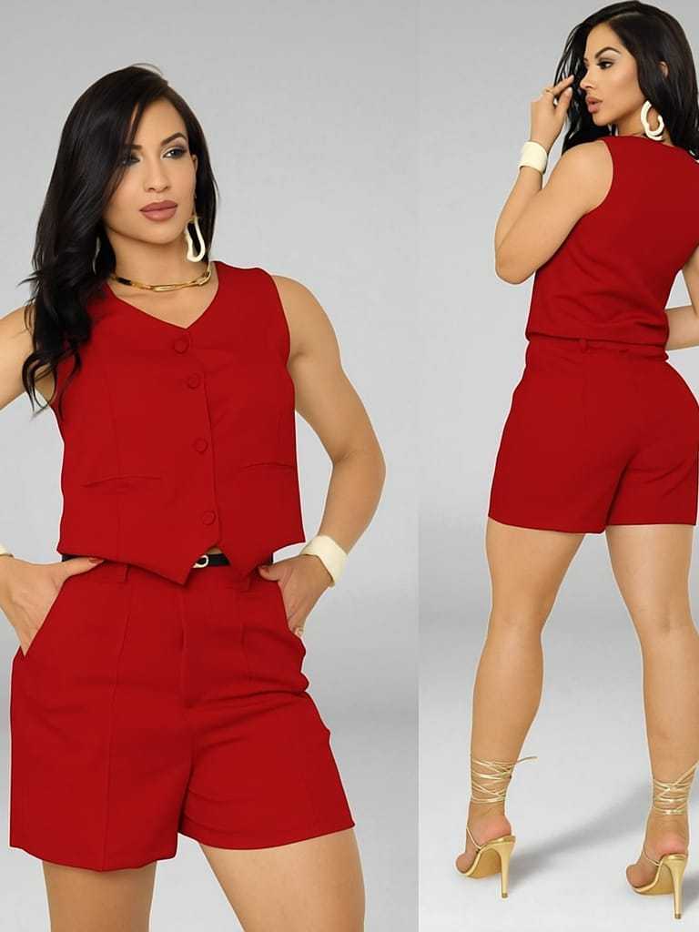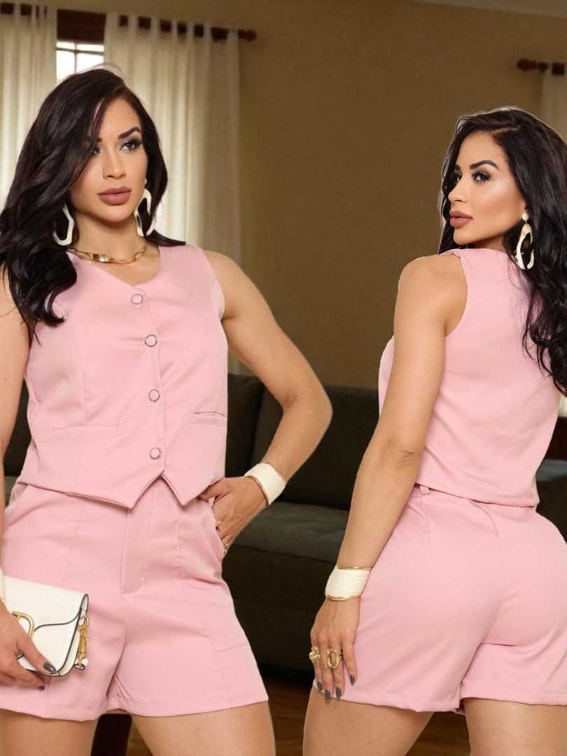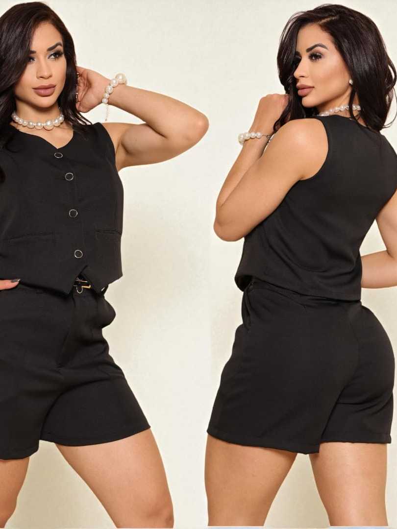 Conjunto Feminino Alfaiataria Colete com Bolso + Shorts com Ziper Frontal Cintura Alta Verão