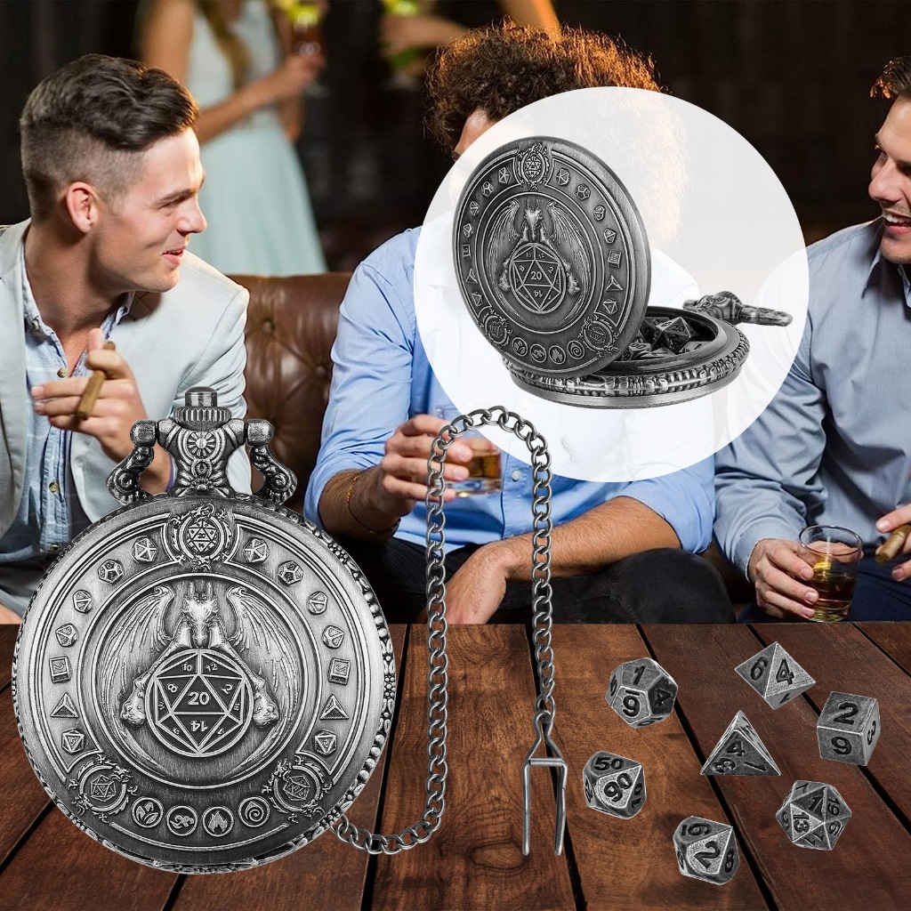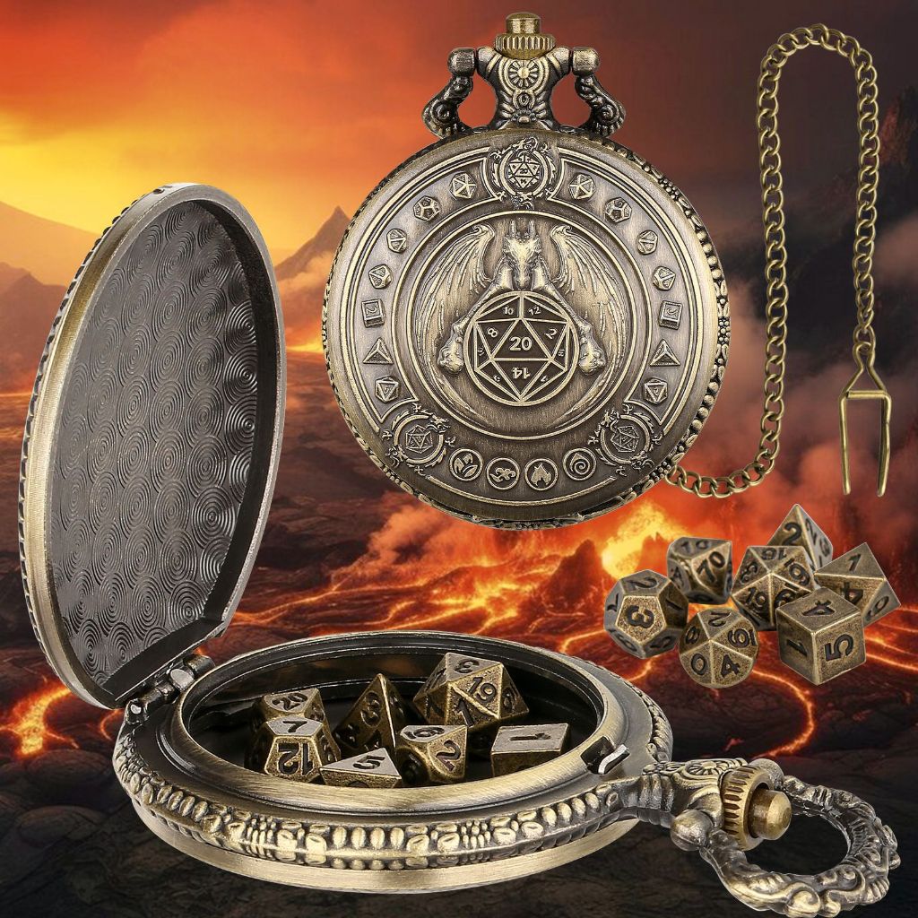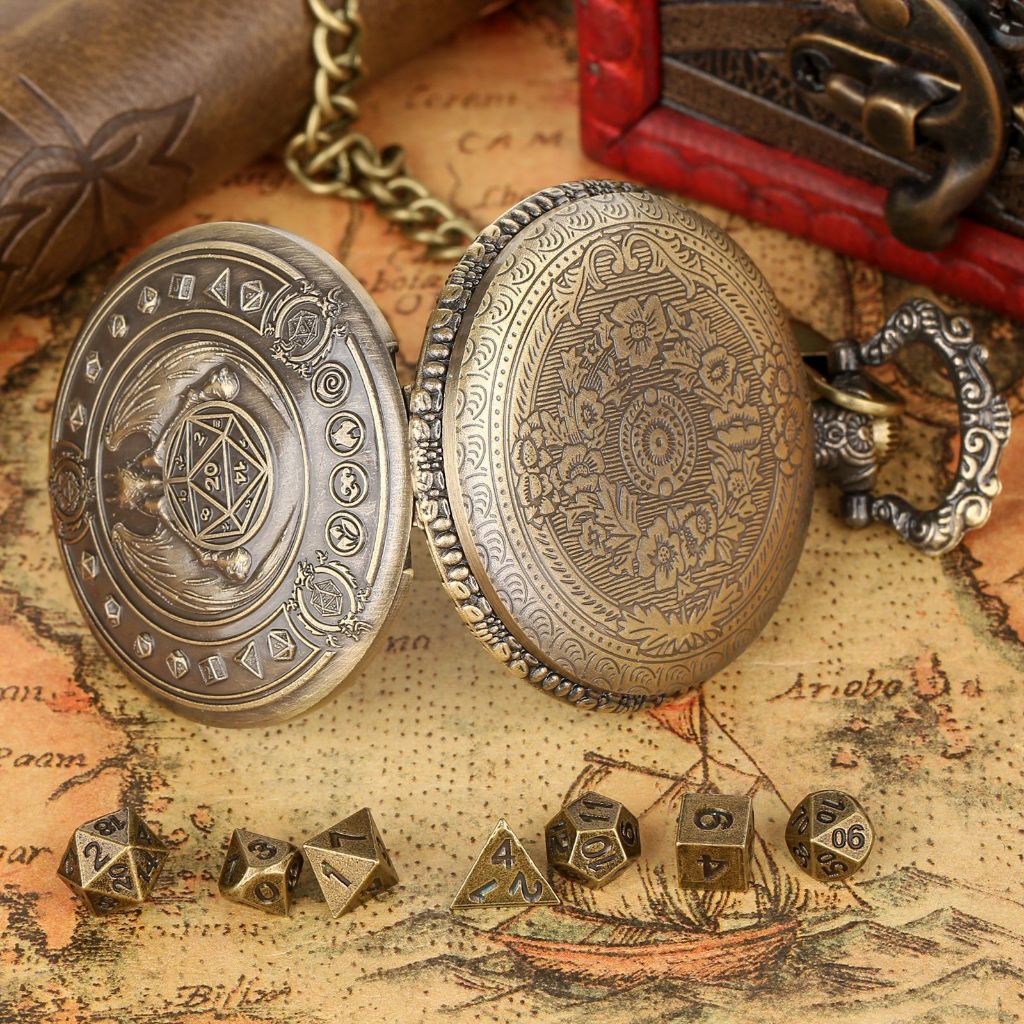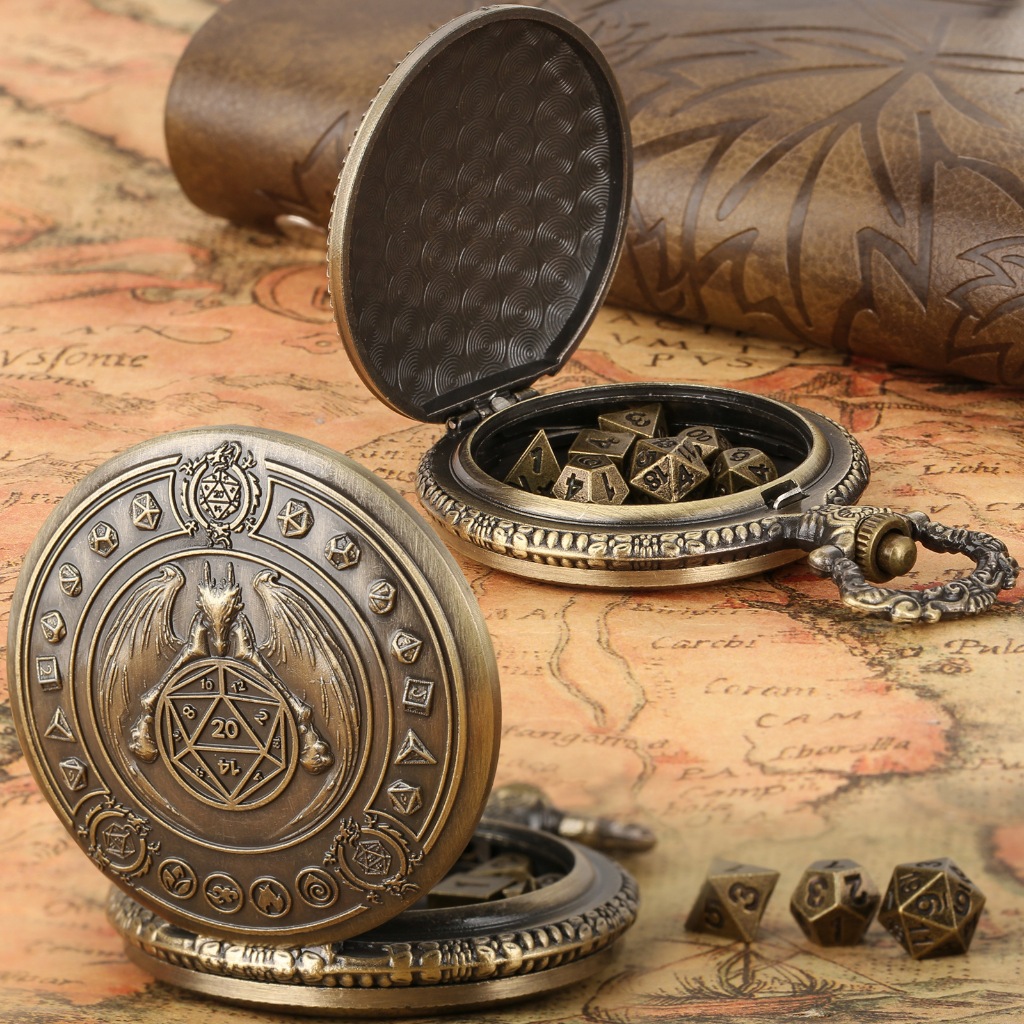 Conjunto de Dados de Metal Poliédrico Bronze, Minúsculo e Gravado com Asas de Dragão, Caixa de Relógio de Bolso com Cadeia para Masmorra, Jogo de Tabuleiro, Dragões, Pathfinder, D&D e RPG