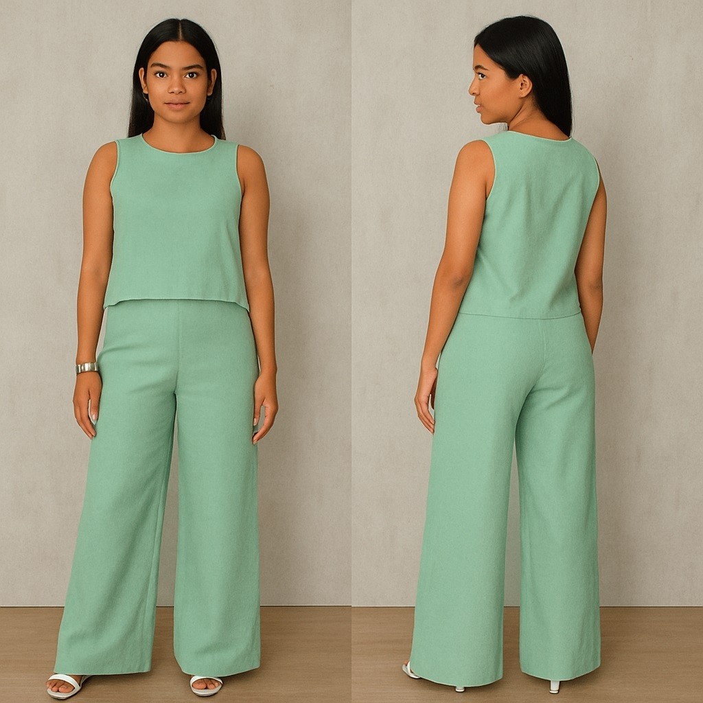 Conjunto Feminino De Linho Alfaiataria Casual Pantalona Camiseta Regata Outono/Inverno