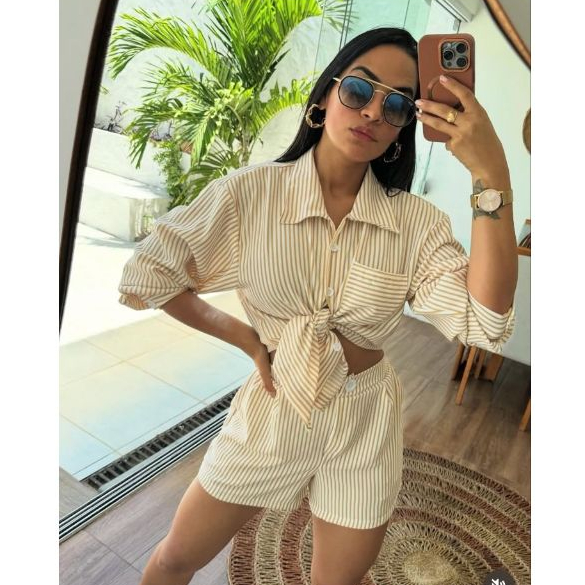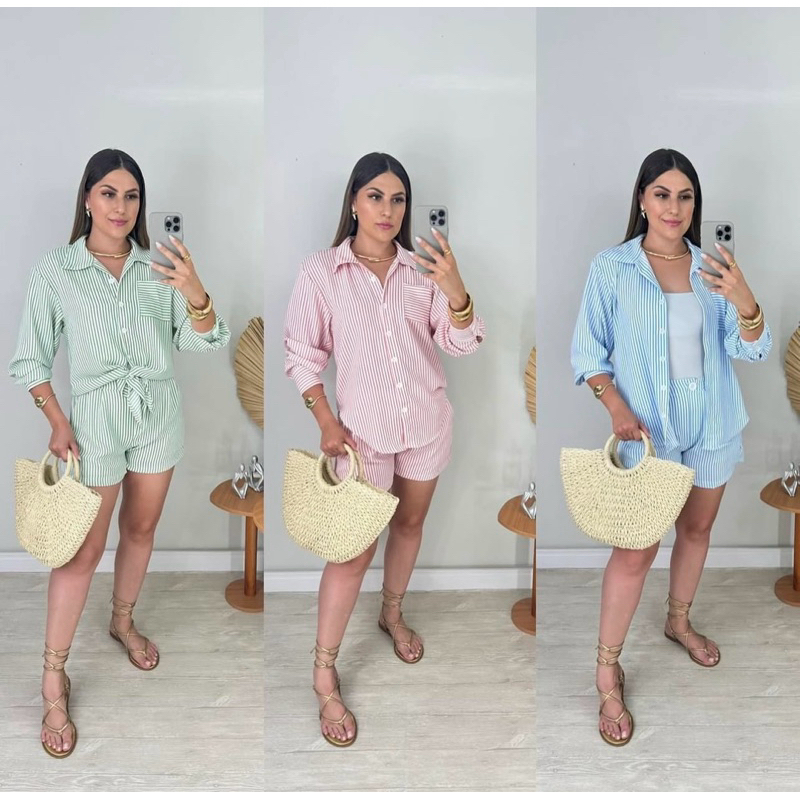Conjunto Feminino Listrado Camisa de botão e Shorts Lançamento Verão