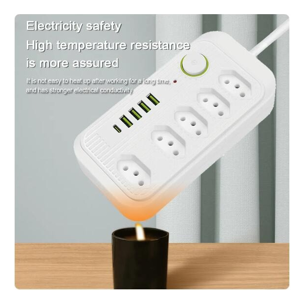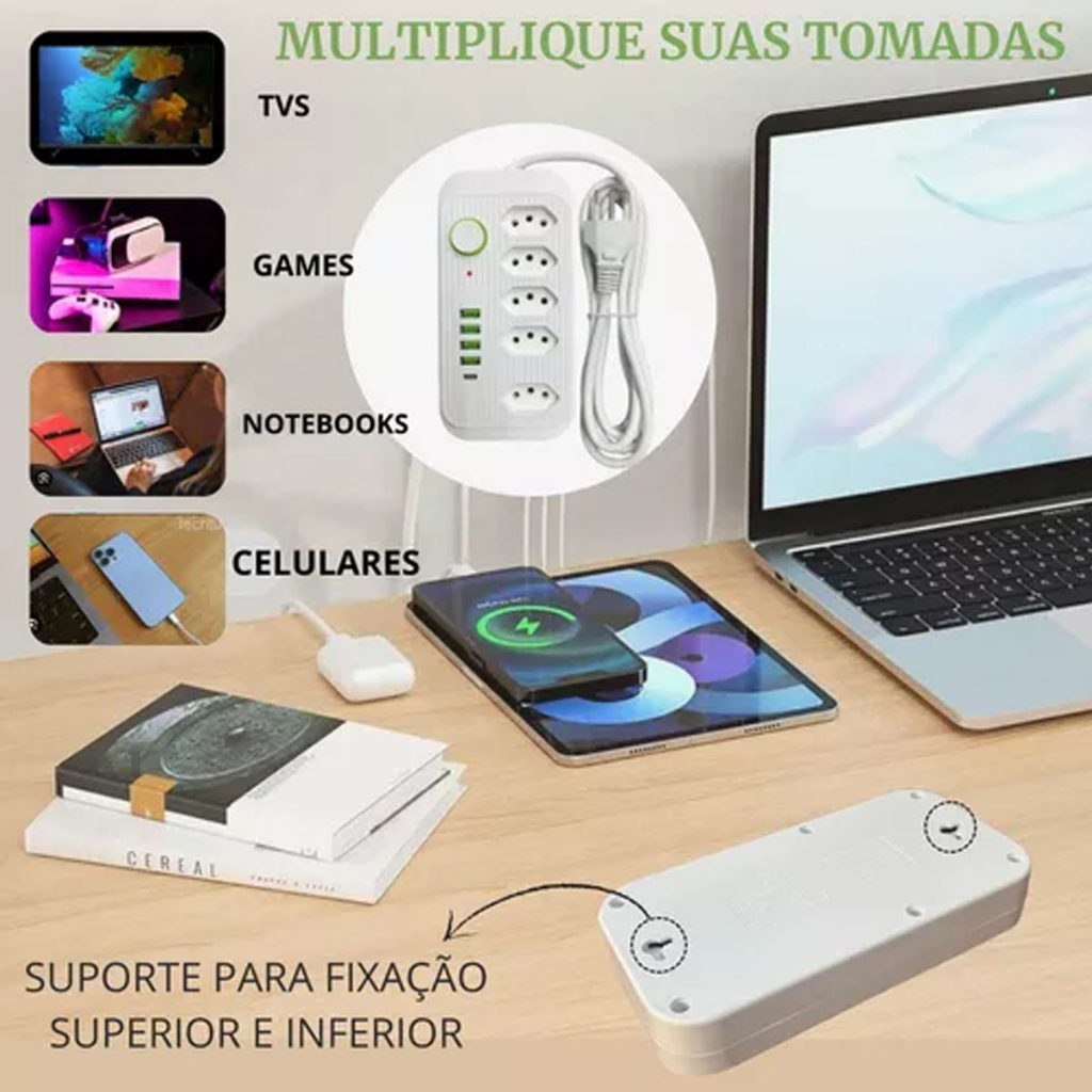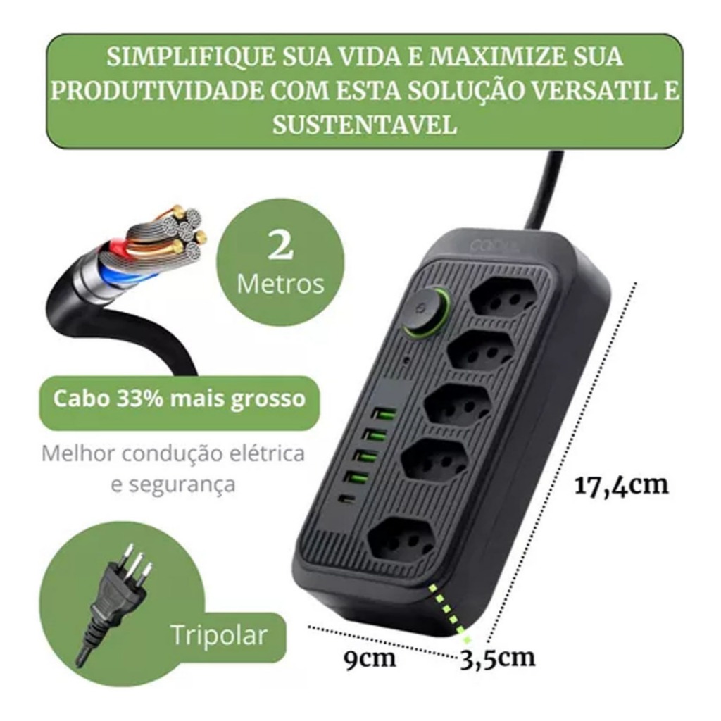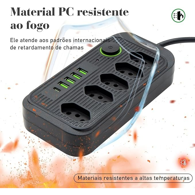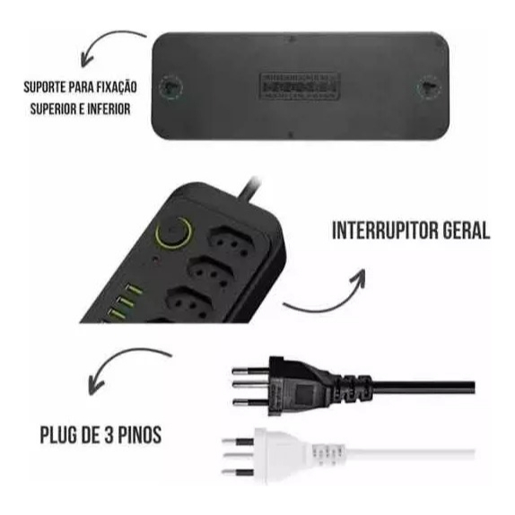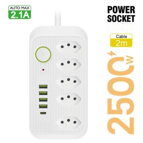 filtro de linha extensão de 2 metros com 5 tomadas 4 usb e 1 entrada tipo-c