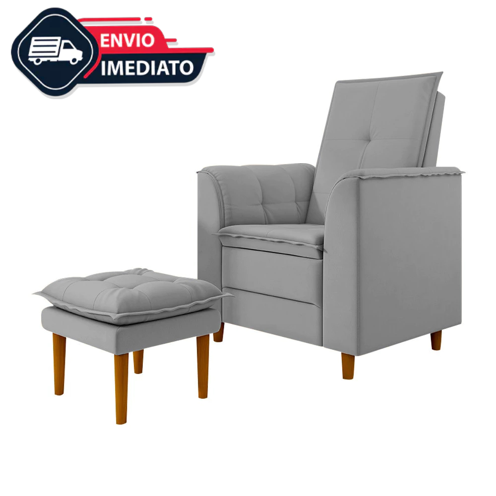 Poltrona de Amamentação Quarto Infantil com Puff Kate Pés Palito Veludo Prata - New Belle