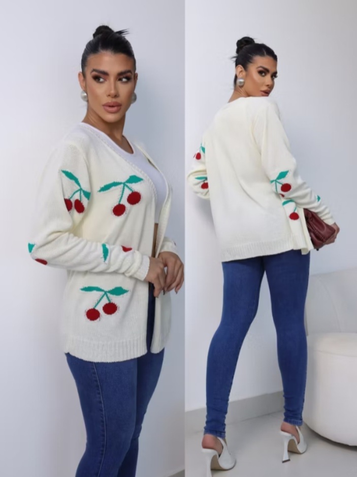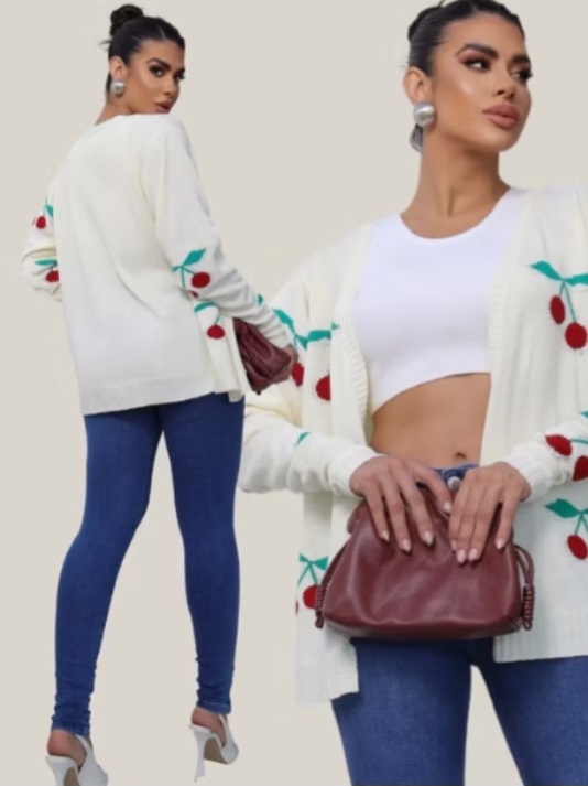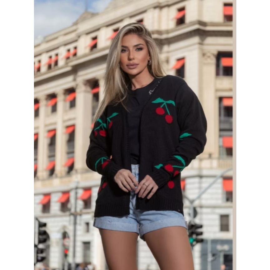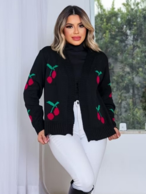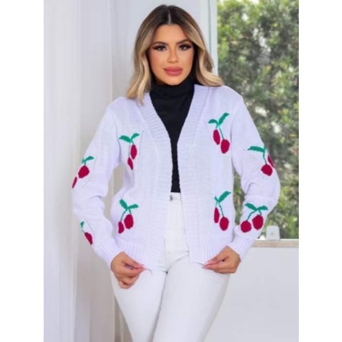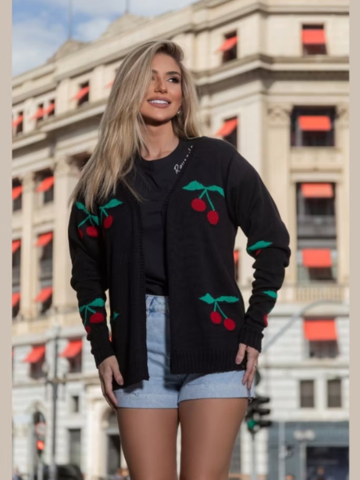 CASACO FEMENINO ESTAMPA CEREJA ESTILIO CARDIGAN ELEGANTE