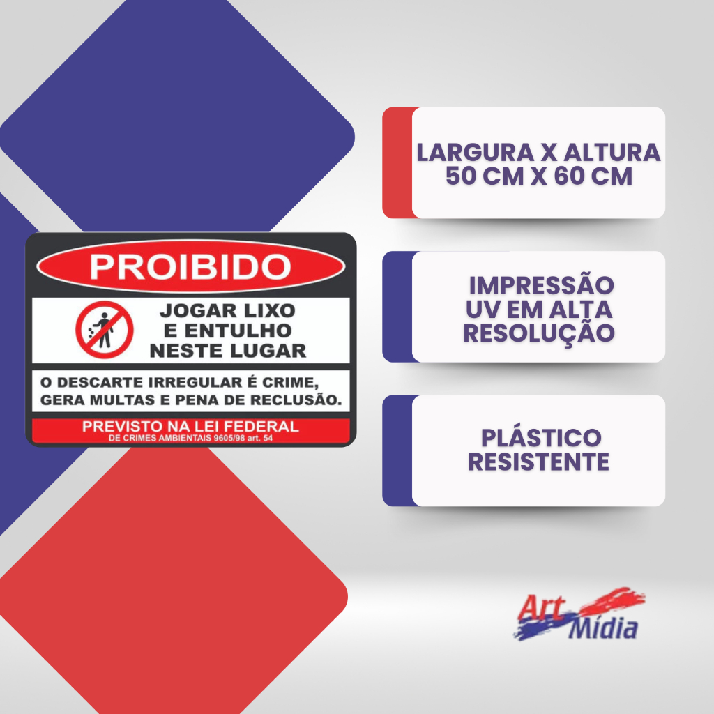 Placa Proibido Jogar Lixo E Entulho Neste Local 50x60