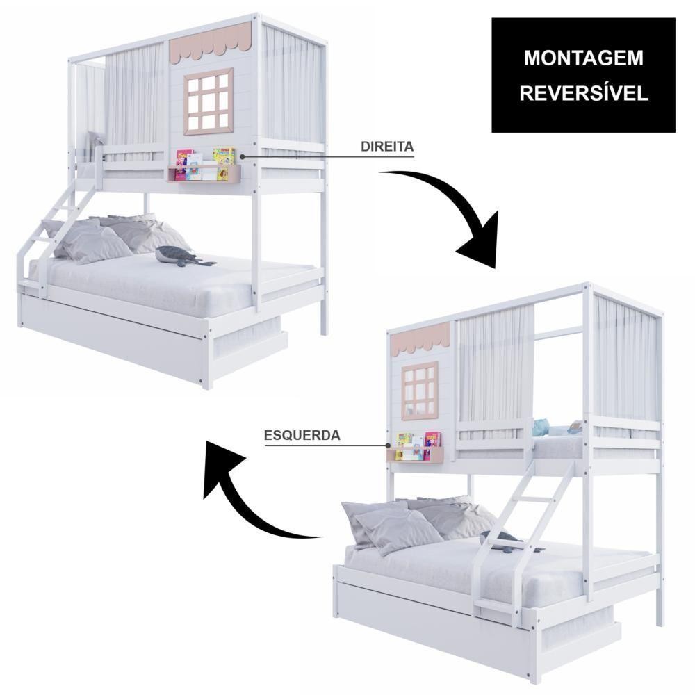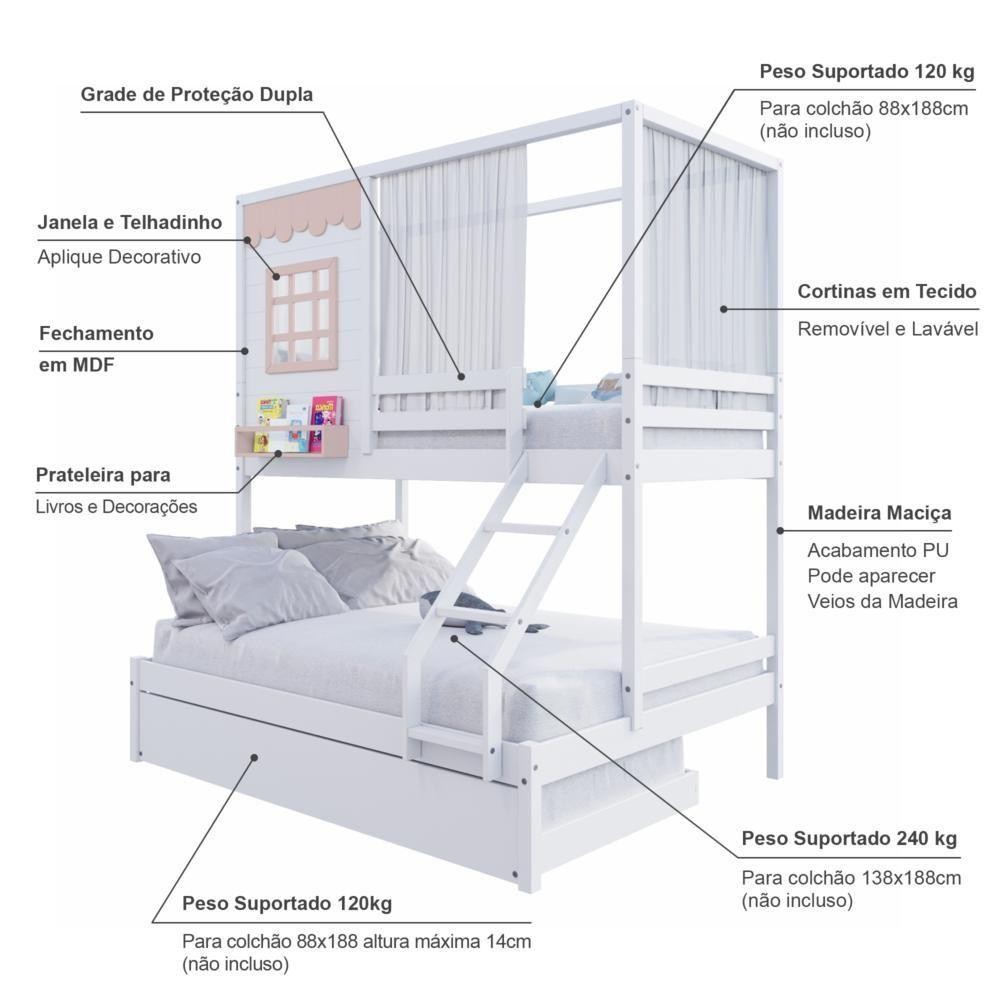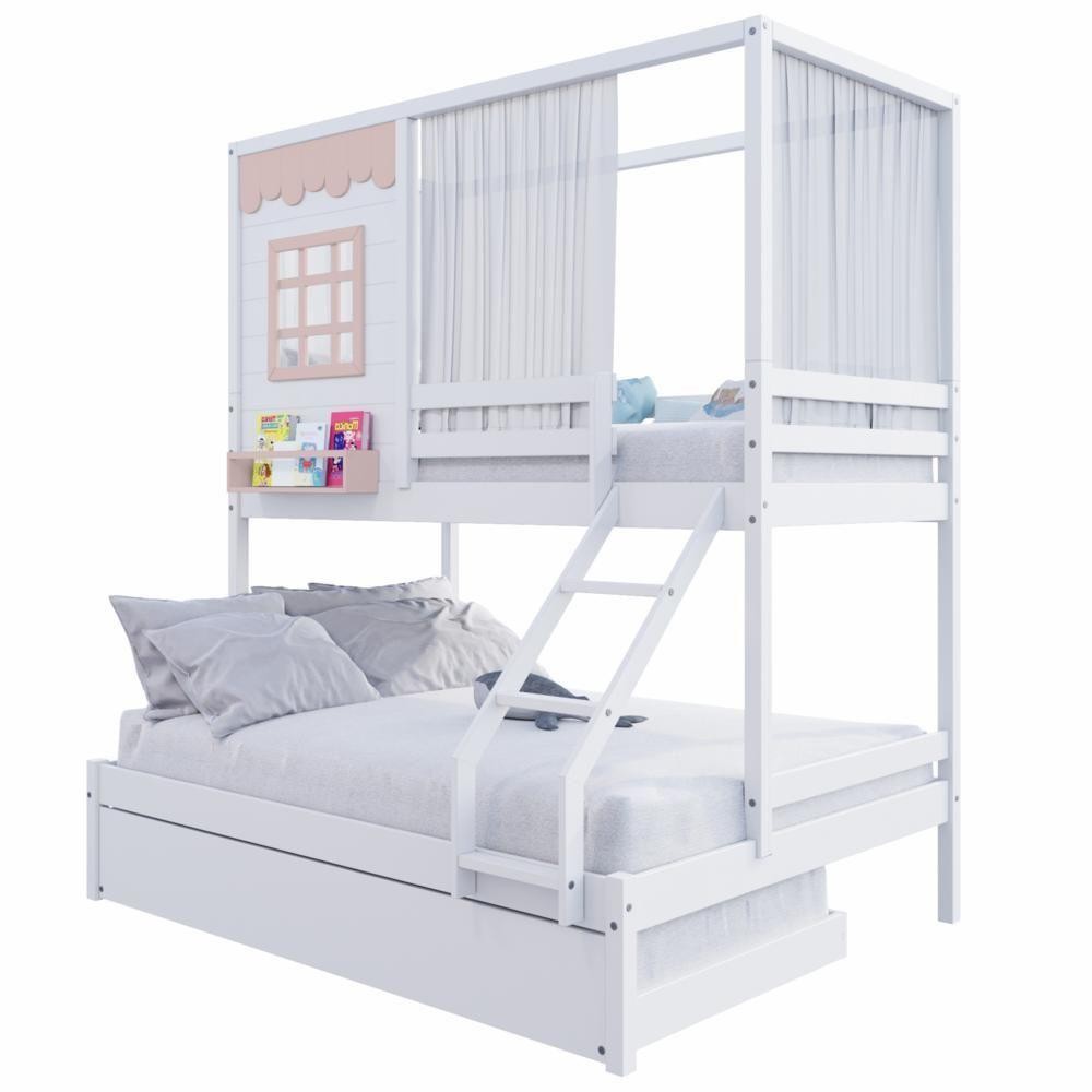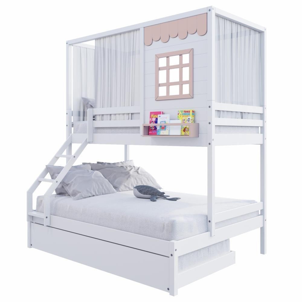 Treliche Casinha Reta Casal/ Solteiro Com Cortina Madeira Maciça Branco/ Rosa Housin