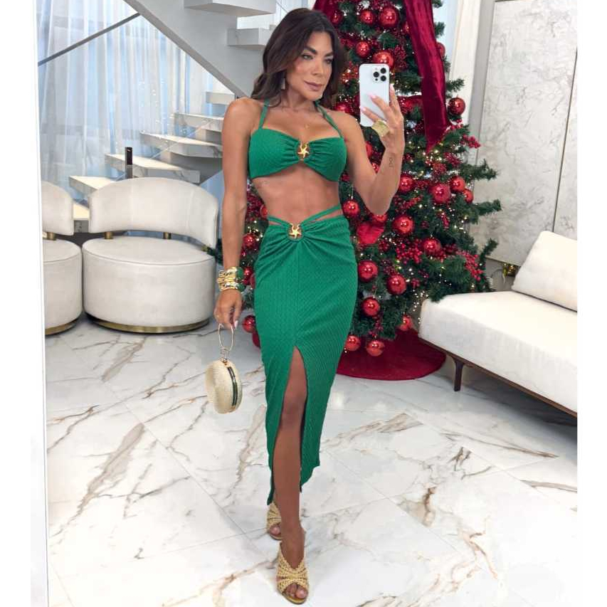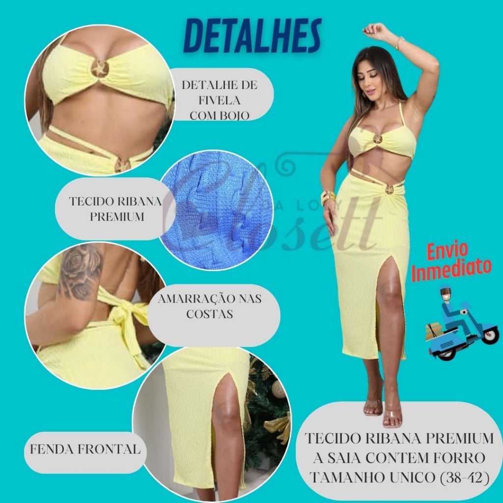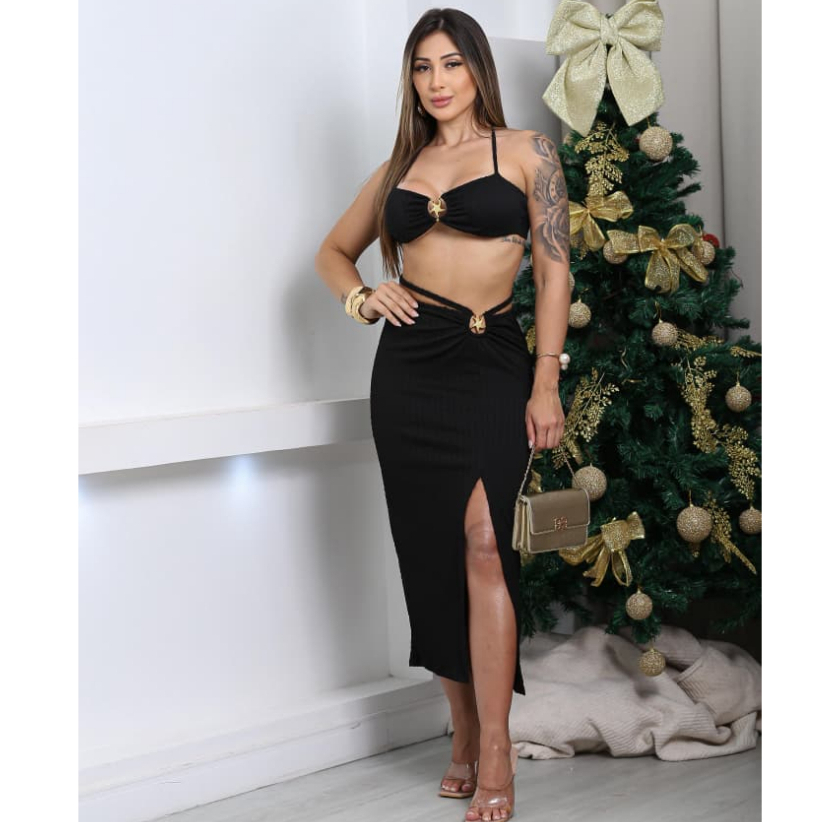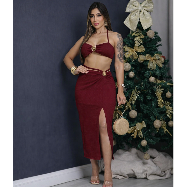 Conjunto Feminino Cropped com Bojo, Saia Midi Forrada e Fenda Lateral, Moda Praia
