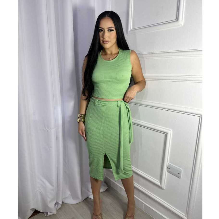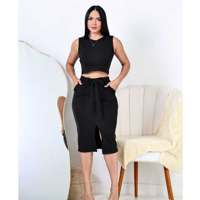 Conjunto Feminino Cropped e Saia Midi, Fenda Frontal, Bolsos Funcionais, Cinto, Cintura Alta -Look Estiloso e Moderna